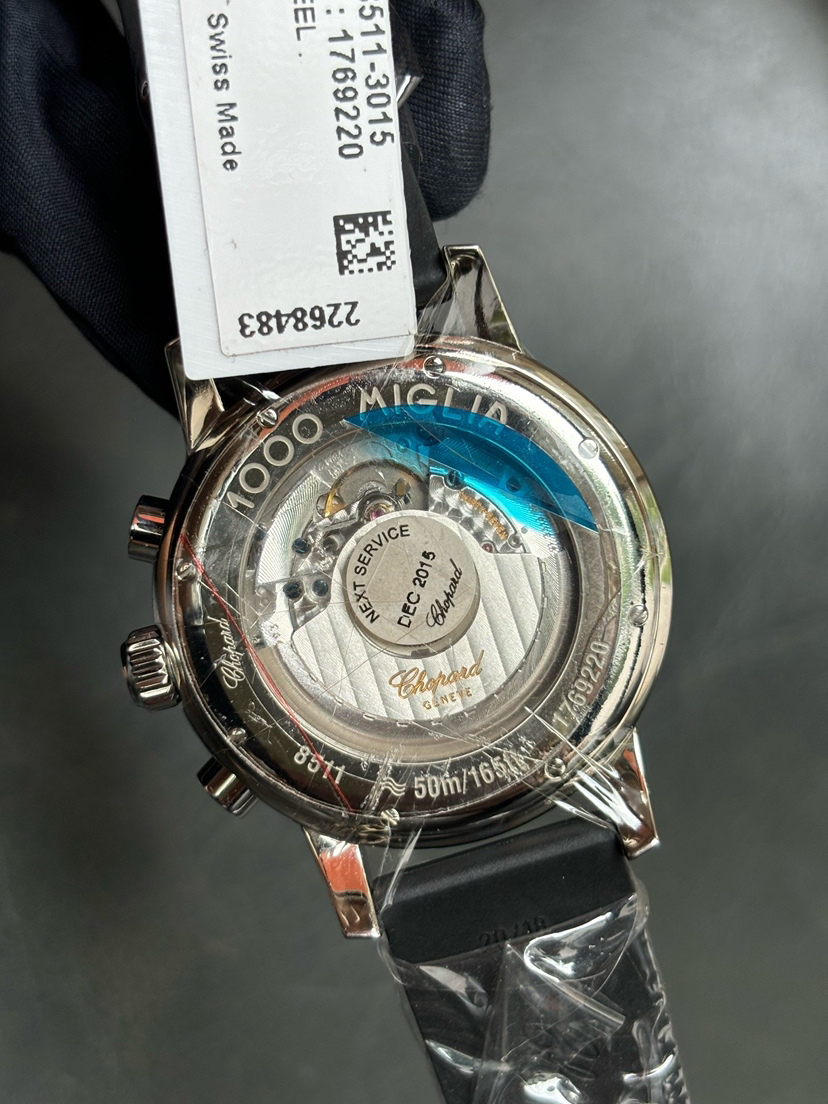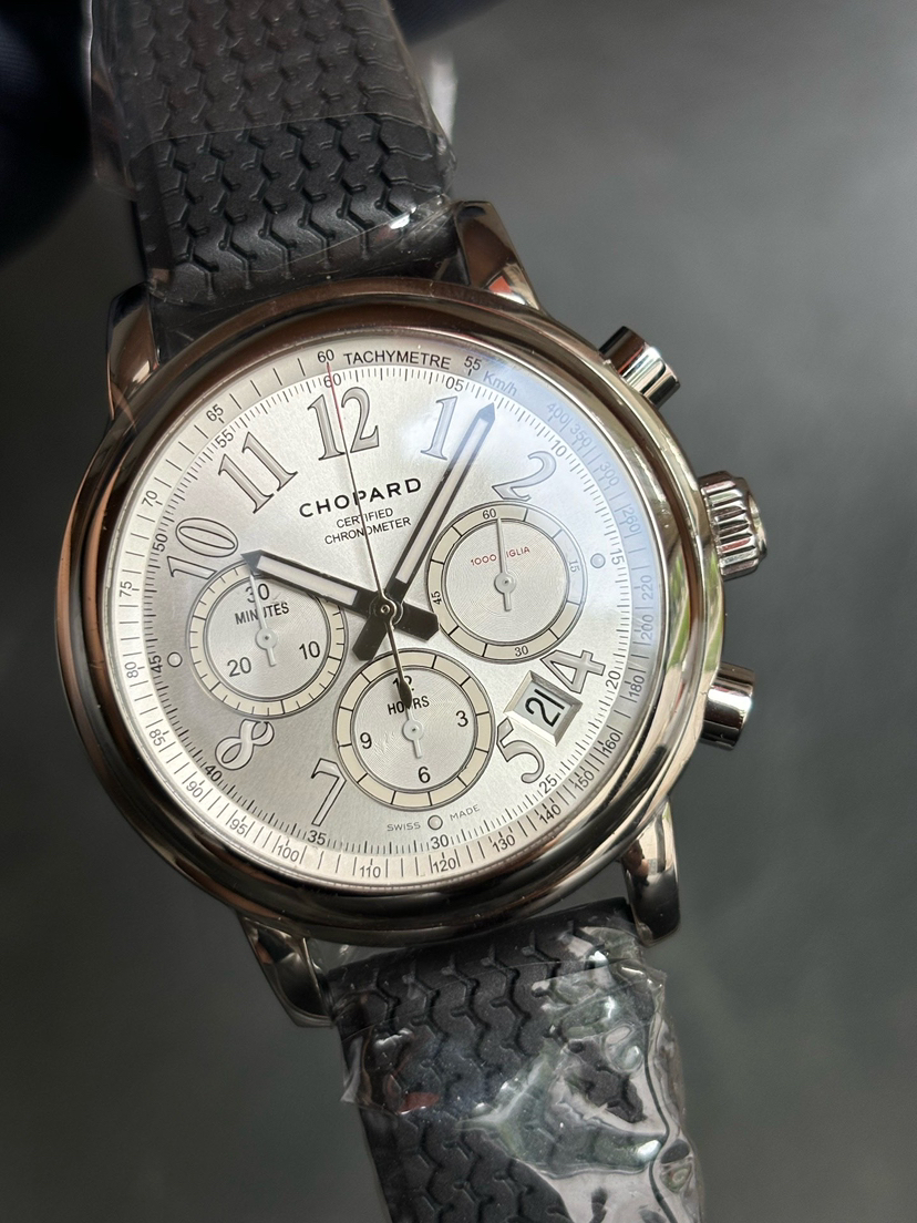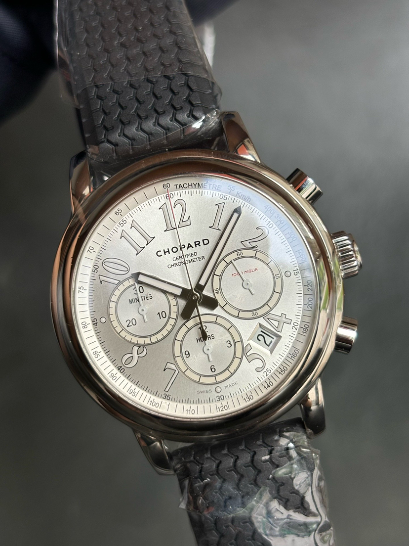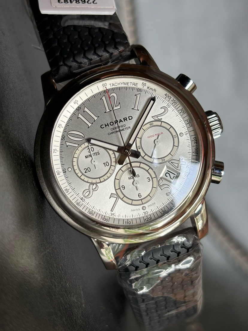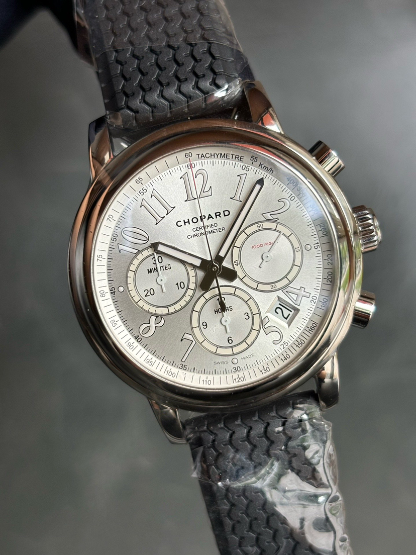 萧邦 赛车 MILLE MIGLIA系列168511-3015 42mm表径 自动机械男士腕表,银灰色表盘配上轮胎纹橡胶表带运动十足,带有日期显示、计时功能,全新未使用单表,公价34300,现货好价~