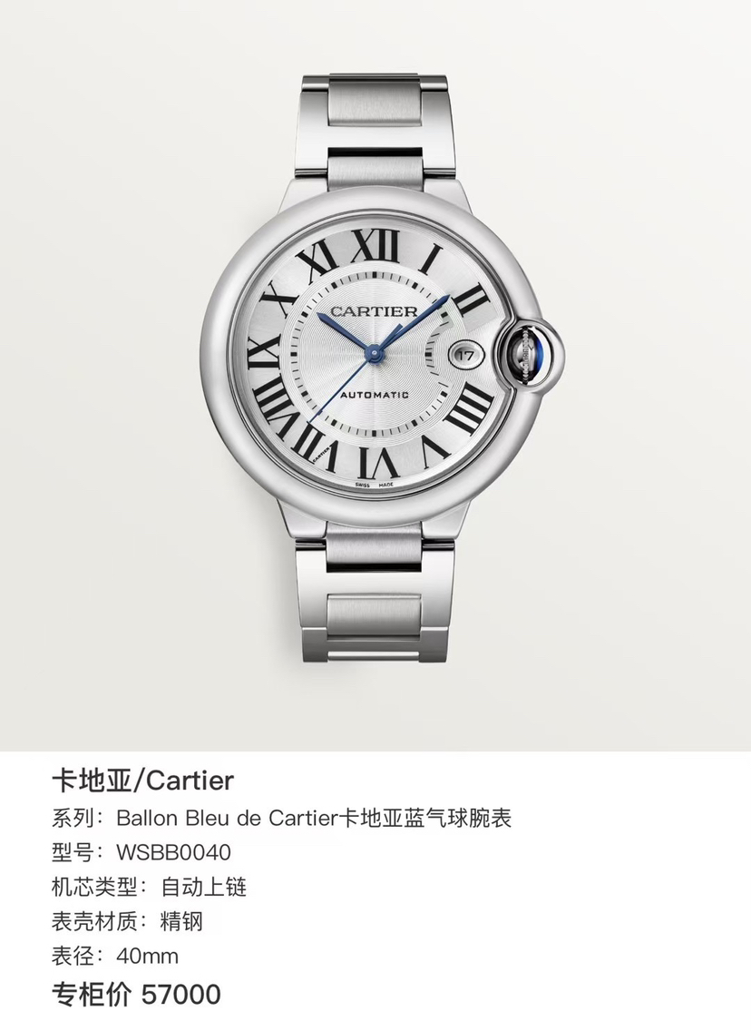卡地亚蓝气球腕表 WSBB0040 男士机械腕表 全套2022年自动上链 精钢 40mm 专柜价57000