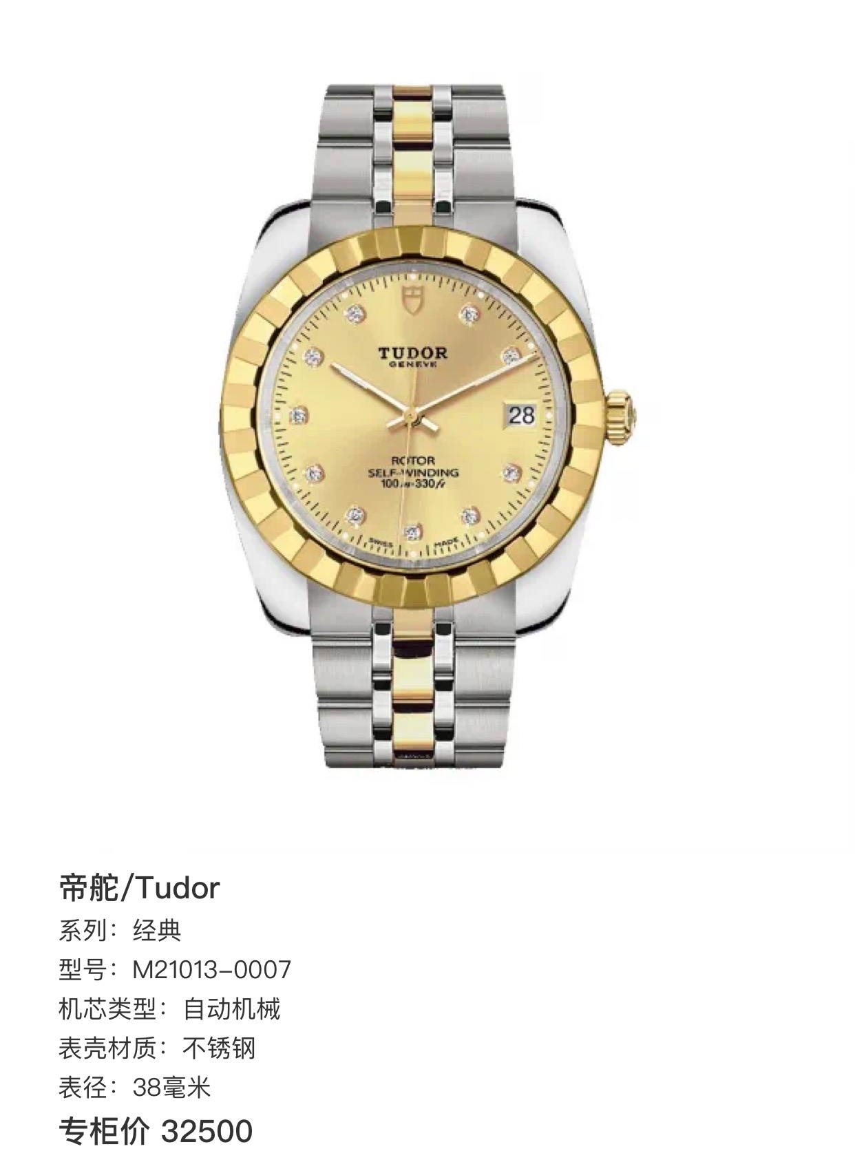 帝舵 经典 M21013-0007 自动机械 不锈钢 38mm表径 专柜价32500 单表好价~