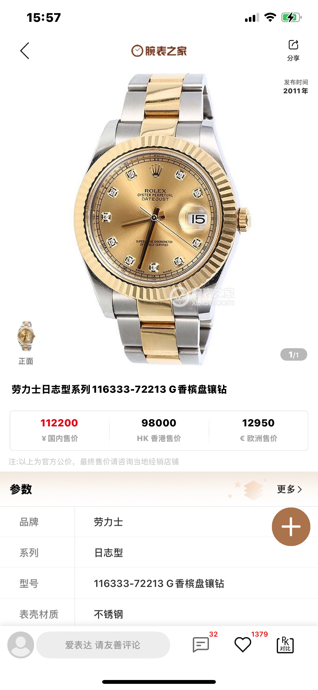 表壳材质:黄金钢(蚝式钢与18k黄金);三角坑纹外圈