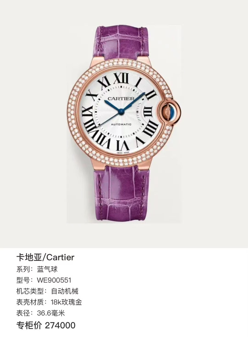 卡地亚蓝气球系列WE900551女士机械腕表,原钻款 整表近新 表径36,18K玫瑰金搭配外圈原钻上手高档精致,热门款,极品单表,后配全新专用皮带,颜值超高,原价274000,现好价