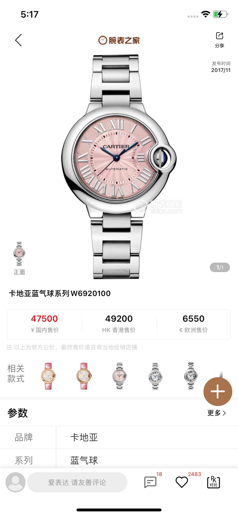 卡地亚蓝气球系列W6920100机械粉气球,33mm表径,最热门气球,公价47500,现好价2xxxx