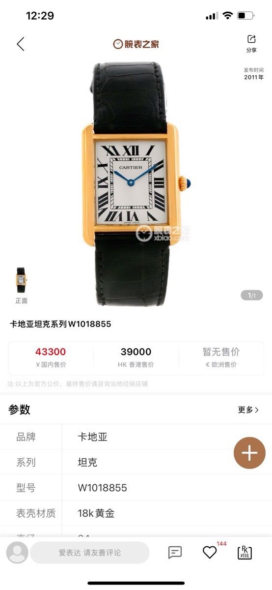 卡地亚坦克系列 W1018855 石英女表 34*27mm表径 18K金材质 二手极品单表 品相极佳 公价43300