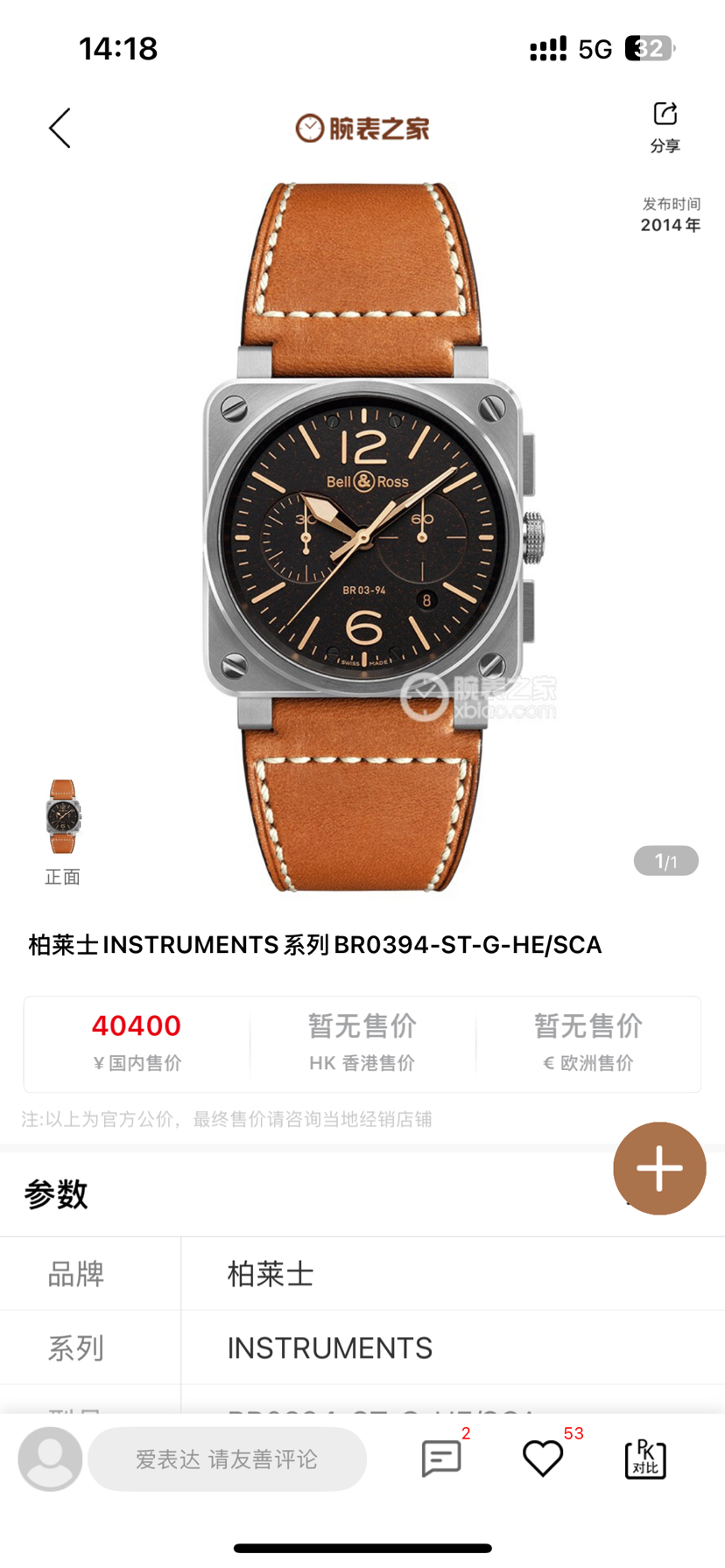柏莱士 INSTRUMENTS系列 BR0394 自动机械男表 42mm表径 计时功能 公价40400 二手极品单表