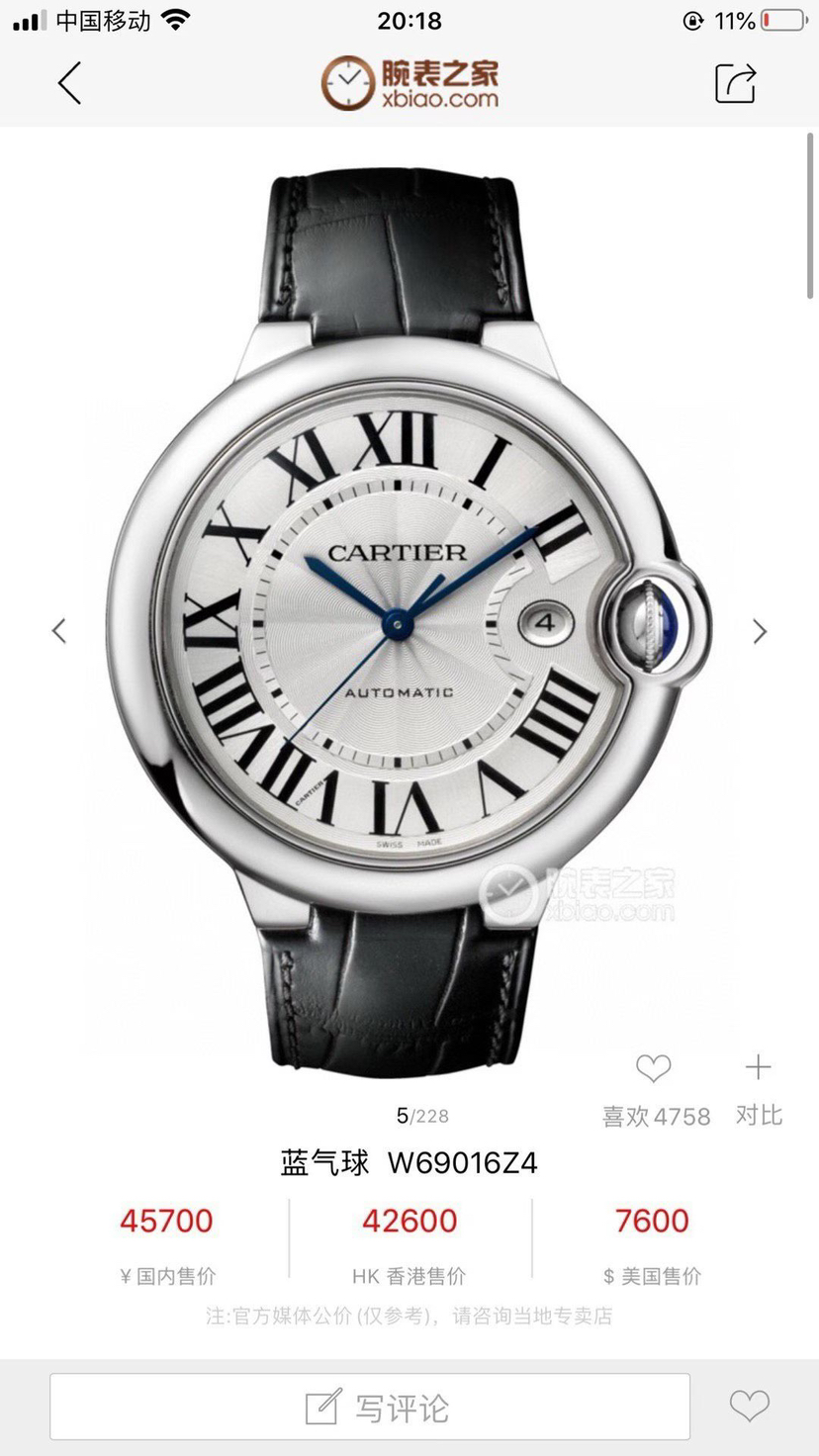 卡地亚蓝气球BALLON BLANCW69016Z4机械男性