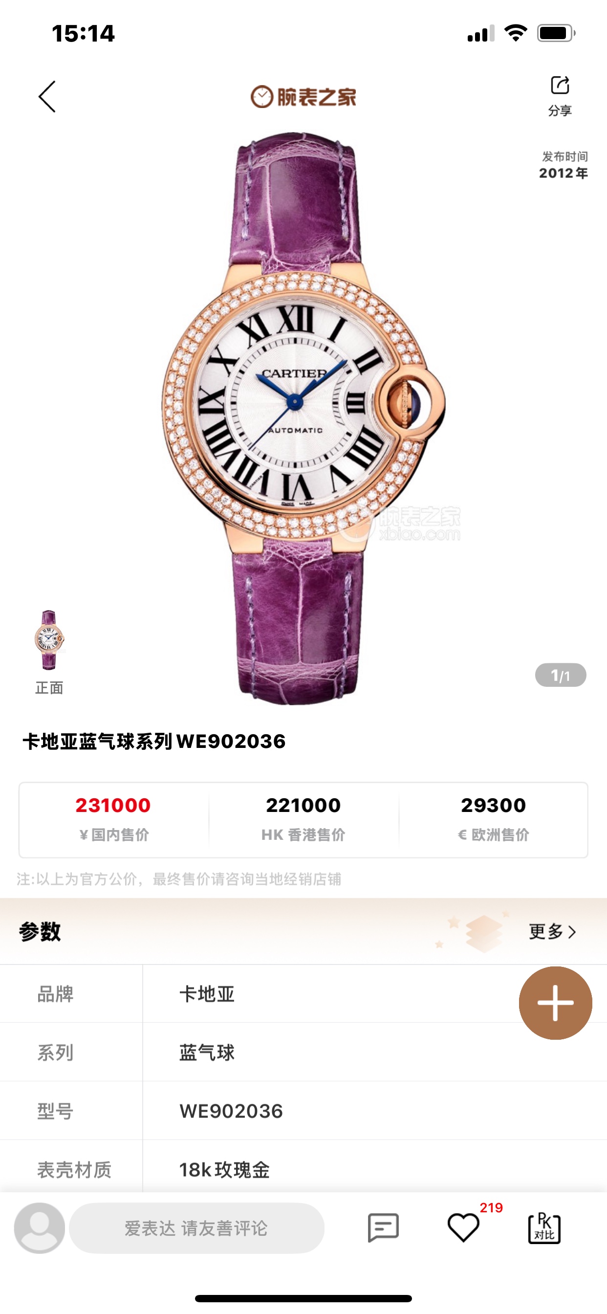 卡地亚蓝气球BALLON BLANCWE902036机械女性