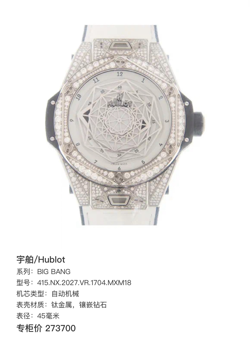 单表 宇舶/Hublot BIG BANG 415.NX.2027.VR.1704.MXM18 自动机械 钛金属,镶嵌钻石 45毫米 专柜价273700