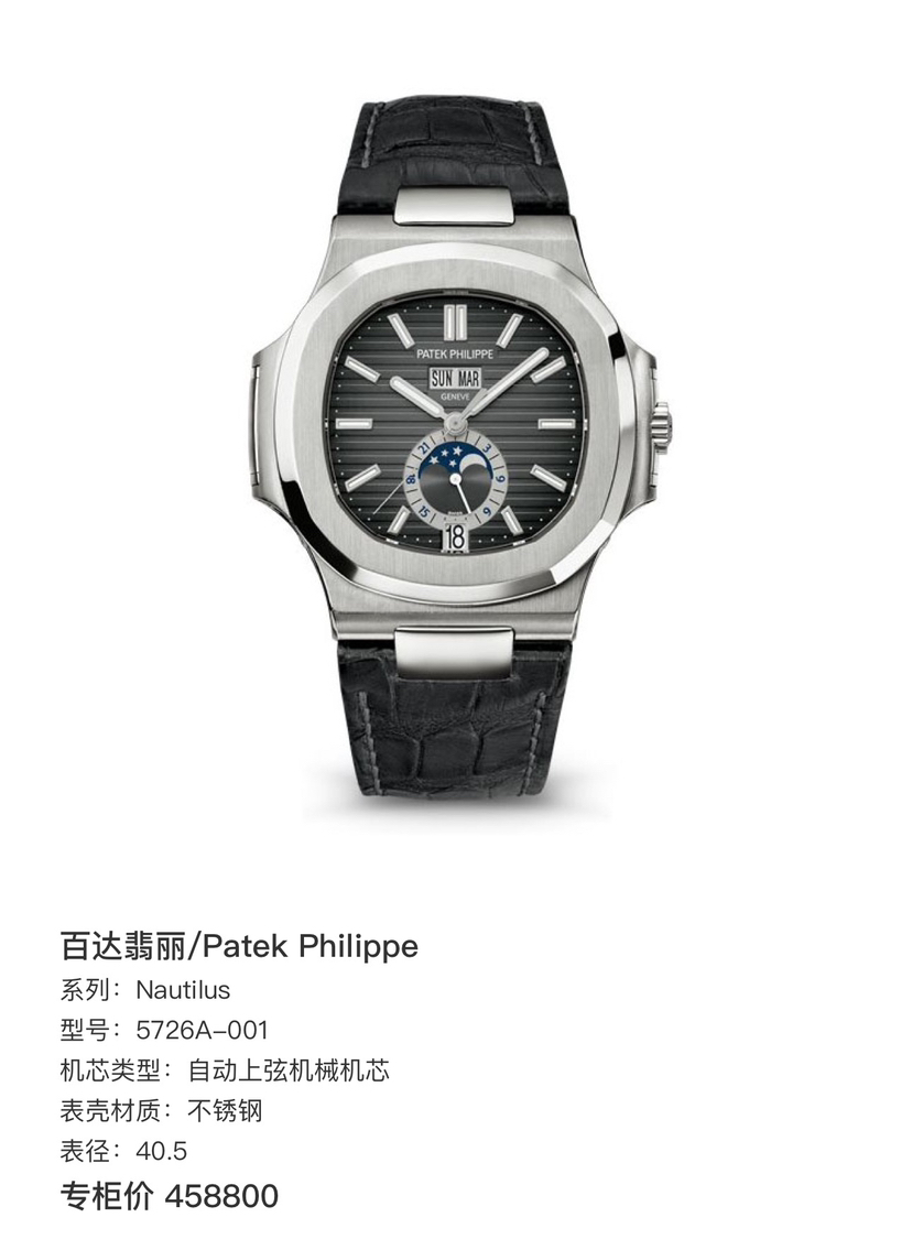 57字头全新单表 百达翡丽/Patek Philippe Nautilus 5726A-001 自动上弦机械机芯 不锈钢 40.5 专柜价458800