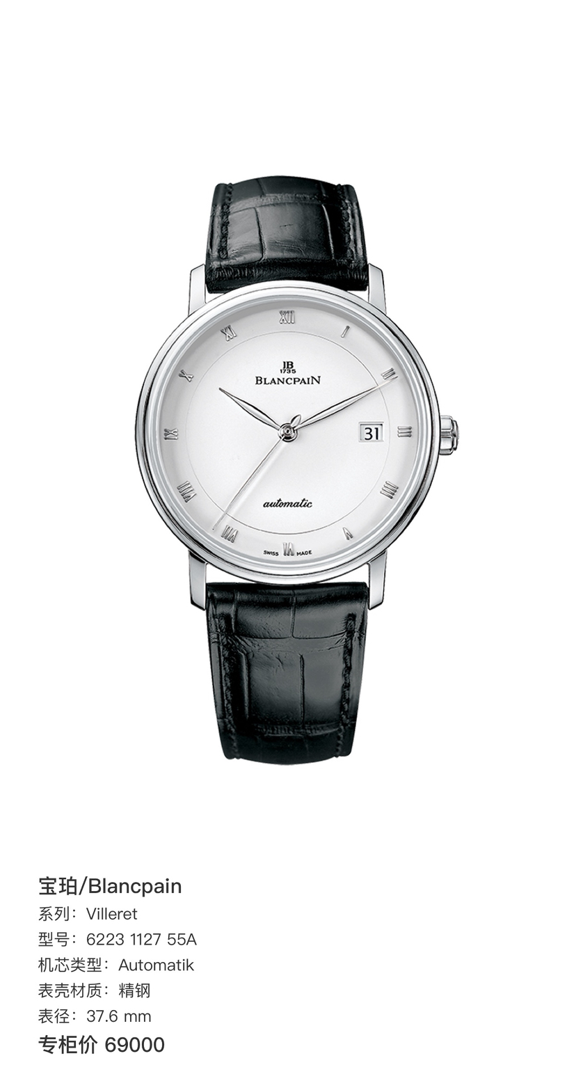 宝珀/Blancpain Villeret经典系列 6223-1127-55A Automatik 精钢 37.6 mm 专柜价69000。