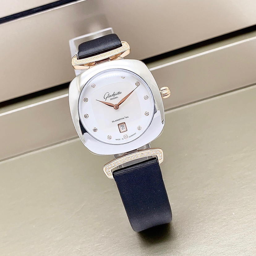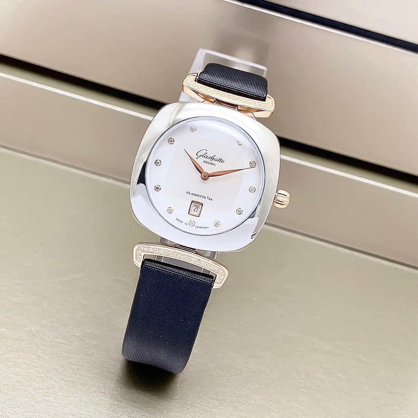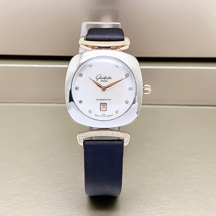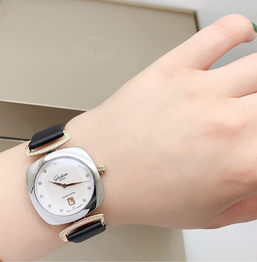格拉苏蒂女士系列原钻女士腕表,间18k金材质,表径31x31mm,石英动力,表盘饰以钻石刻度,两针设计,优雅的贝母表盘,6点位日历显示窗,上手精致时尚,专柜价63000