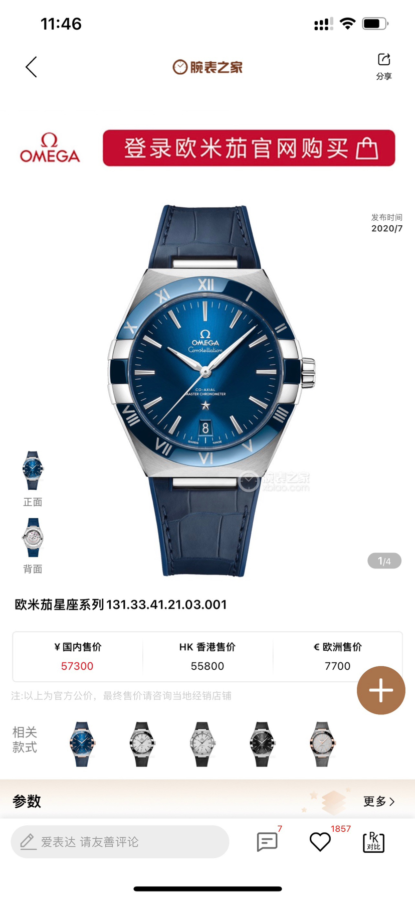 欧米茄131.33.41.21.03.001星座曼哈顿男士自动机械表,蓝面陶瓷圈,表径41mm,8900防磁机芯,原价57300