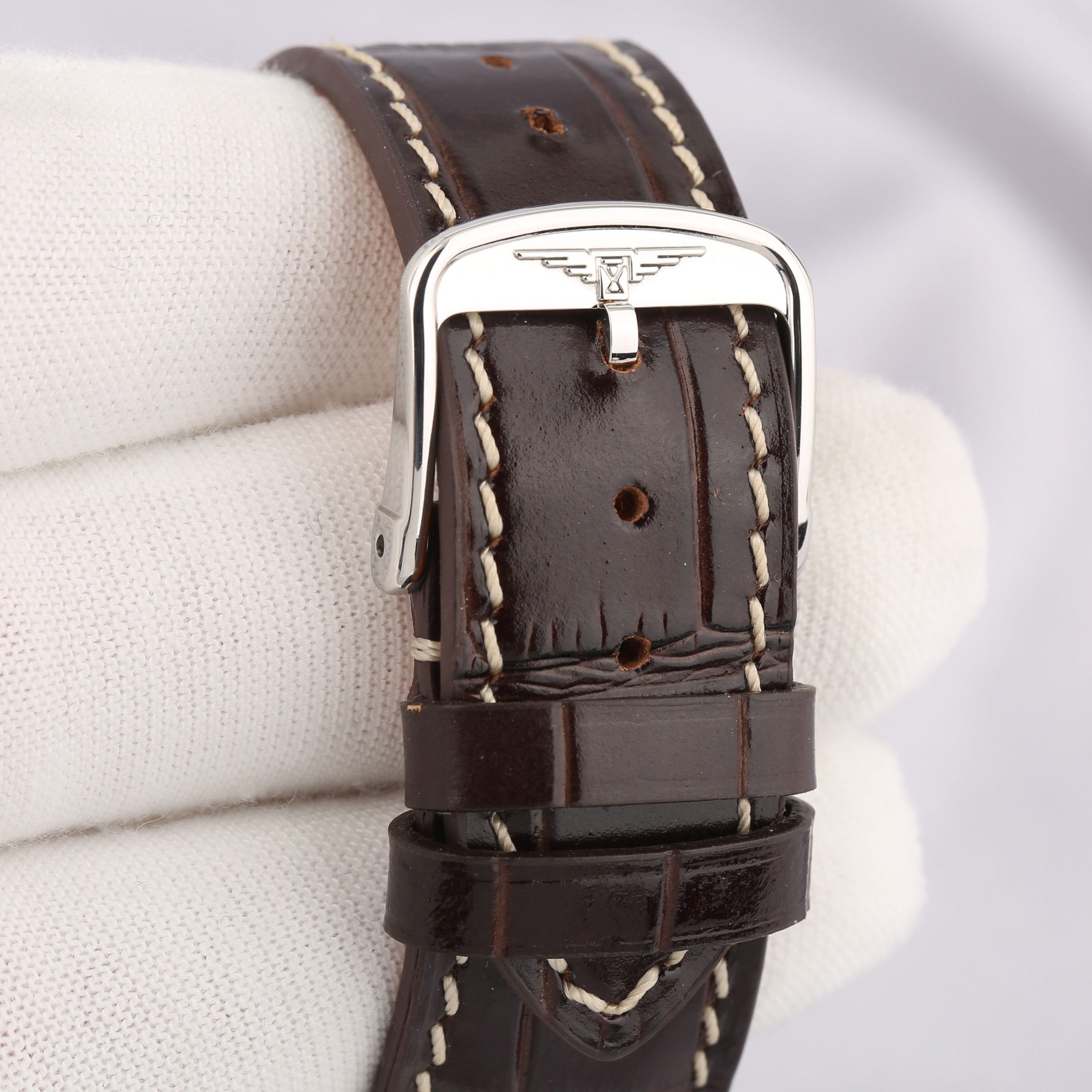 金色剑形指针搭配金色时标,在白色盘面上格外显眼,确保读时一目了然,在腕表的6点钟位置,还设有一个日期显示窗口,增加实用性