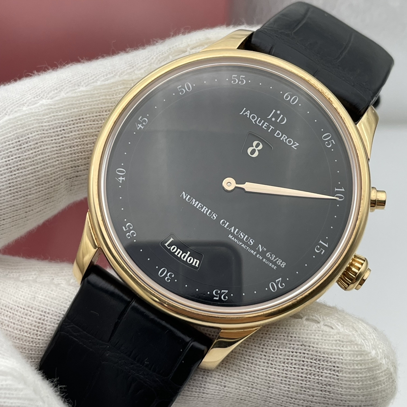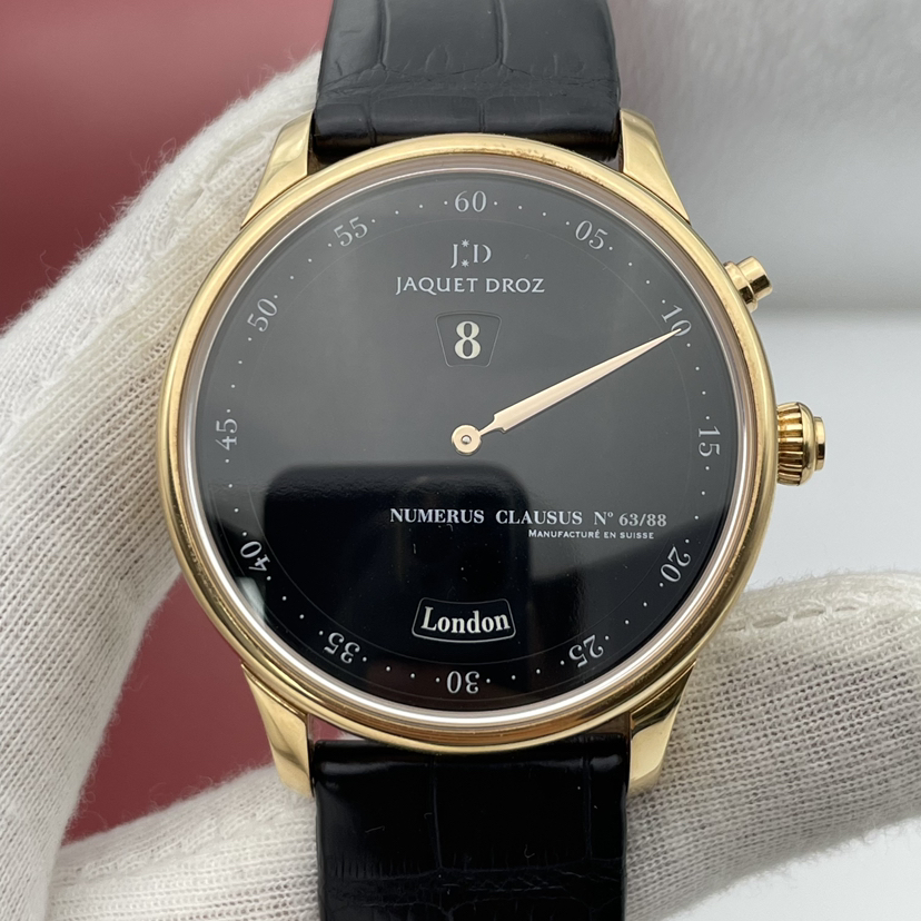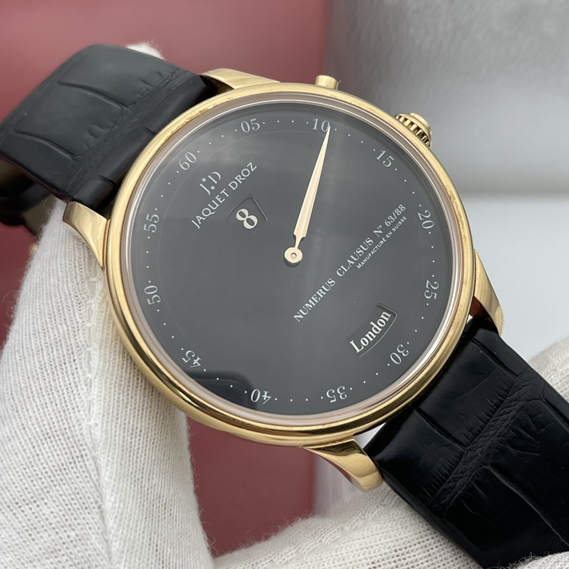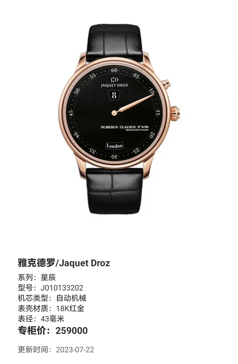 雅克德罗星辰系列J010133202,著名的十二名城腕表,全球限量88枚,男士自动机械腕表,43毫米表径,大明火珐琅表盘,18K玫瑰金材质,独眼龙跳时,极简单一指针,世界时显示功能 ,搭载着具跳时功能的复杂机芯,更具有68小时动力储存的两个独立而平行同步运行的复杂机械装置,配合表盘设有的2个显示窗:6时位置的视窗显示所挑选的12个城市名称,12时位置的视窗显示当地时间,一旦你选择好一个城市,腕表便会瞬跳显示出当地时间。公价259000,现极品单表好价分享