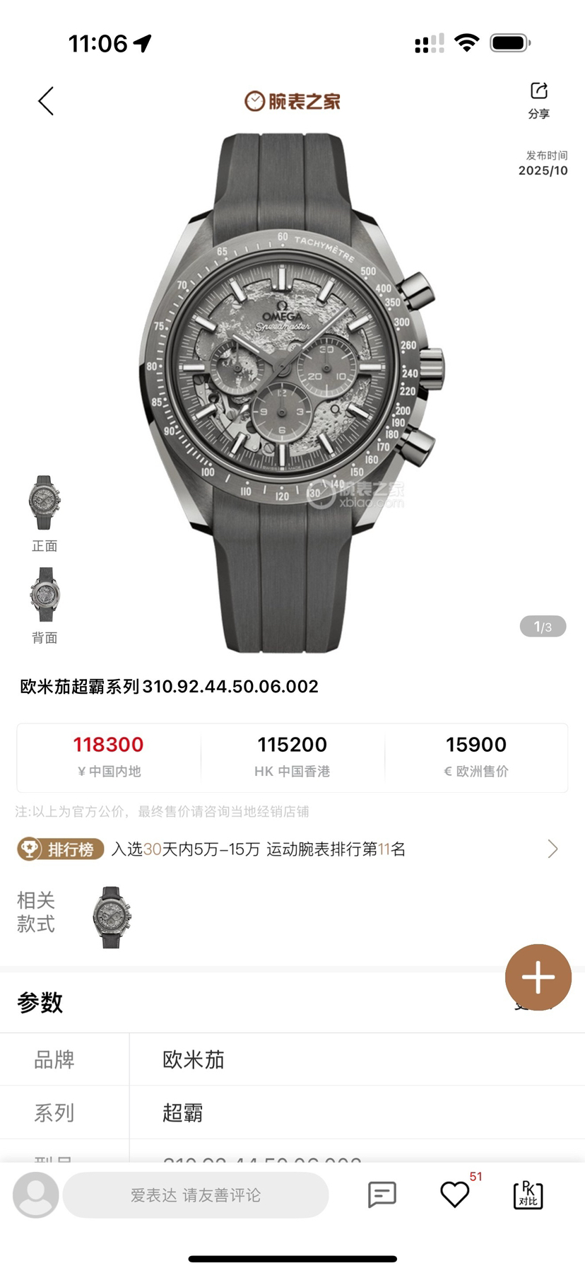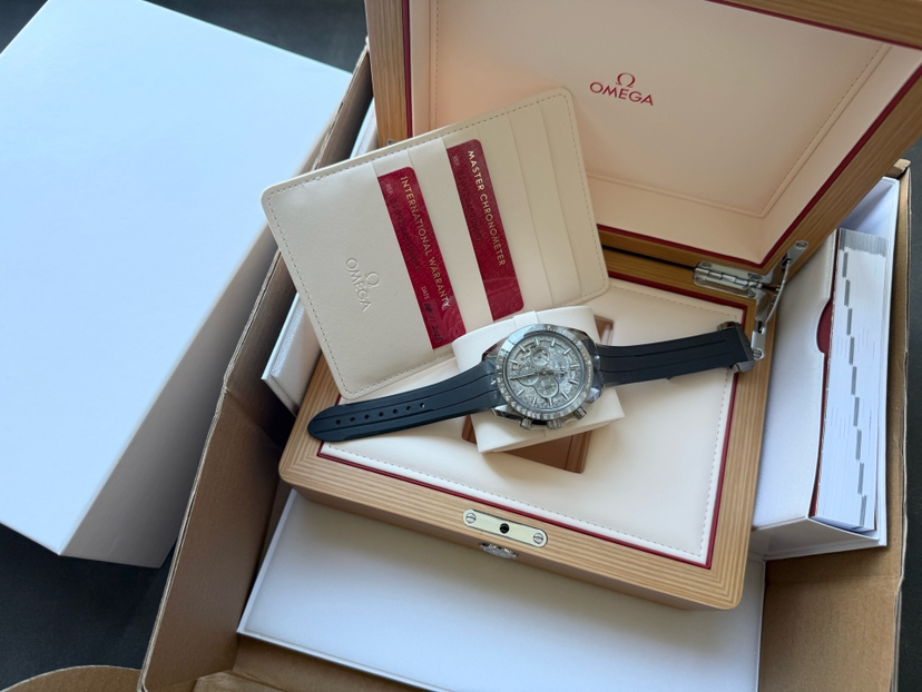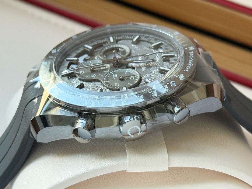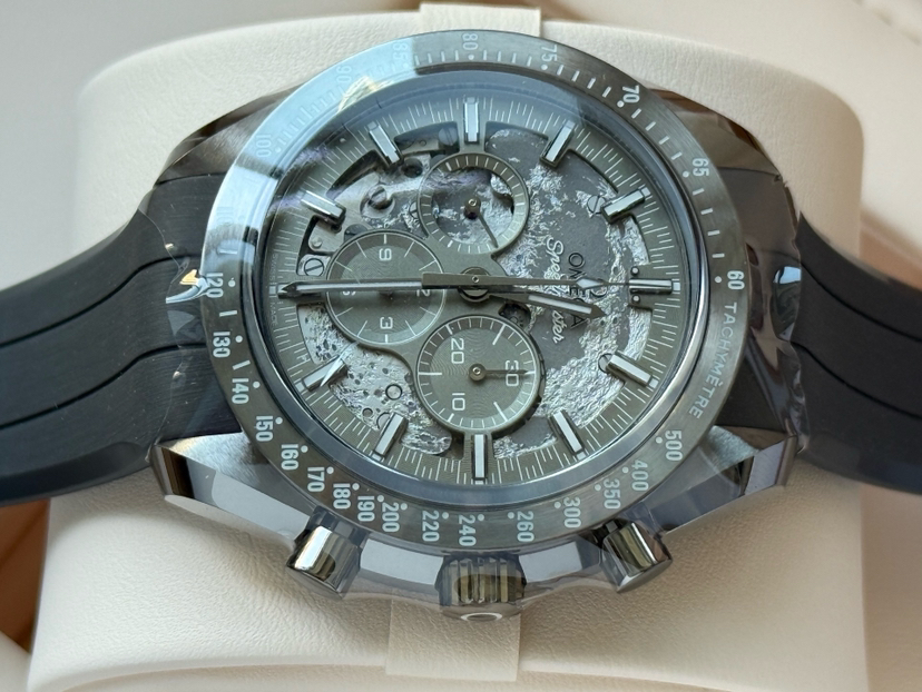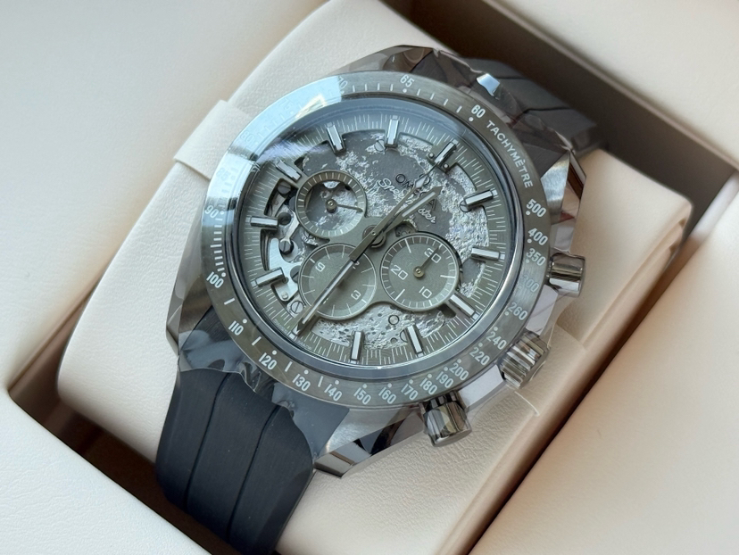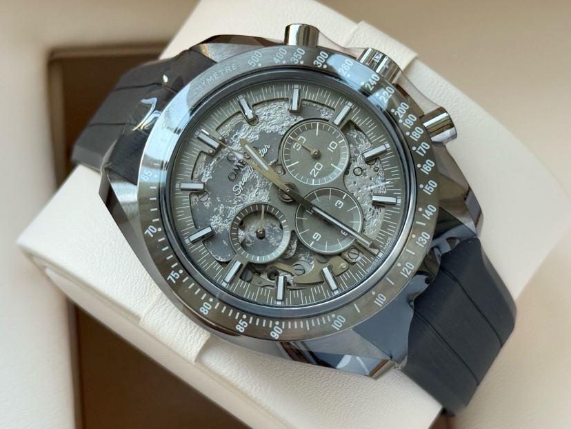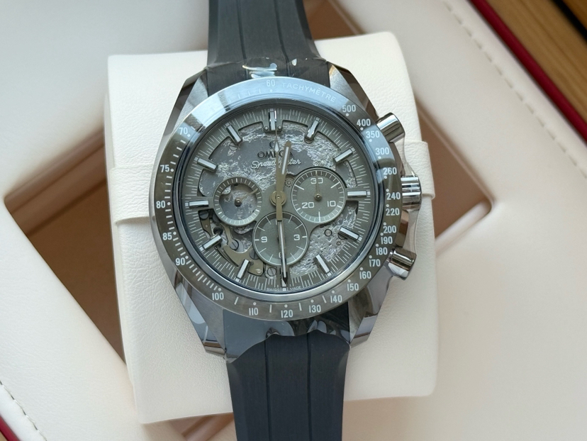 欧米茄超霸310.92.44.50.06.002最新款二代“皓月之灰”男士手动机械表,灰陶瓷材质,50小时动储,表径44mm,全新全套未使用25年11月8日保卡,专柜价118300,超低折扣