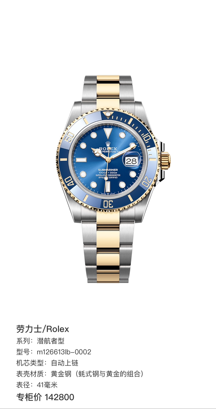 劳力士/Rolex 潜航者型 m126613lb-0002 自动上链 黄金钢(蚝式钢与黄金的组合) 41毫米 专柜价142800