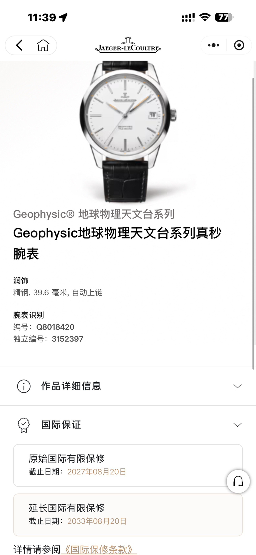 积家/Jaeger LeCoultre 地球物理天文台 8018420 自动机械 精钢 39.6毫米 专柜价 71000