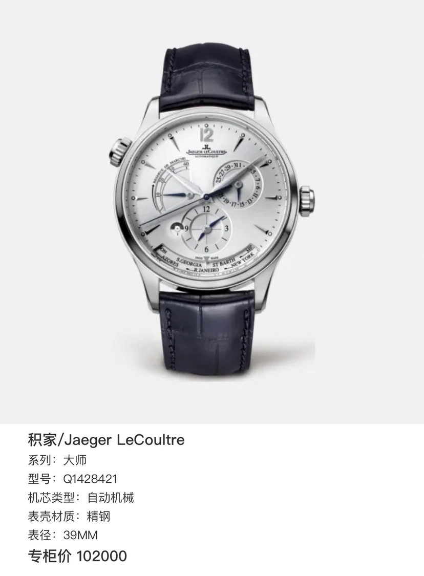 19年库存品单表 好价 积家/Jaeger LeCoultre 大师 Q1428421 自动机械 精钢 39MM 专柜价102000 北京现货欢迎操作