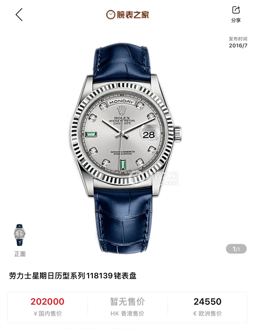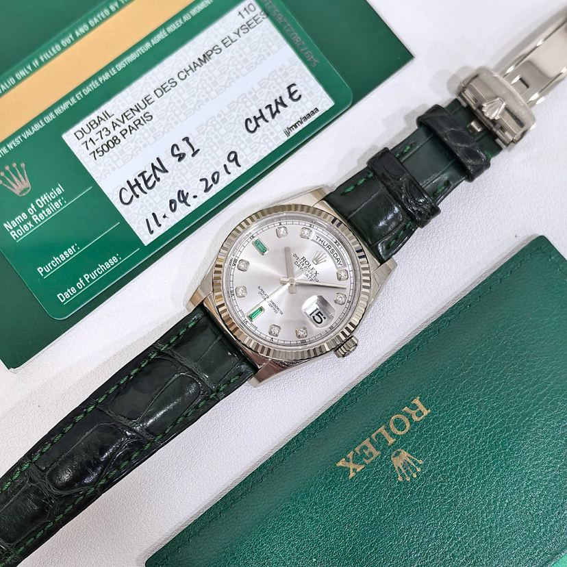 公价202000 劳力士星期日历型系列 型号118139 自动机械 表径 36mm 材质 18k白金 功能 日期 星期显示 2019年全套