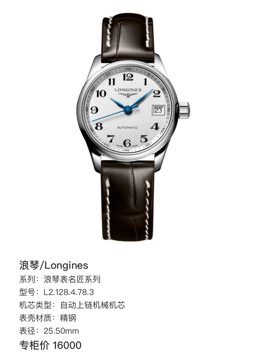 浪琴/Longines 浪琴表名匠系列 L2.128.4.78.3 自动上链机械机芯 精钢 25.50mm 专柜价16000