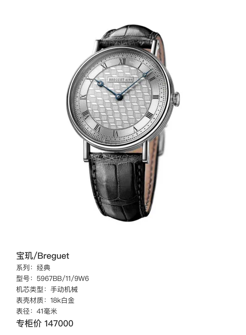 宝玑/Breguet 经典 5967BB/11/9W6 手动机械 18k白金 41毫米 专柜价147000 极品单表,现货好价。