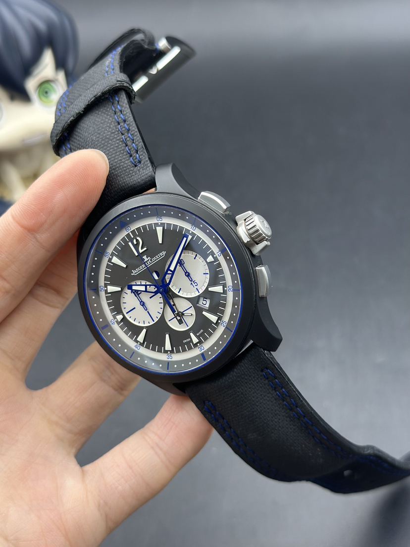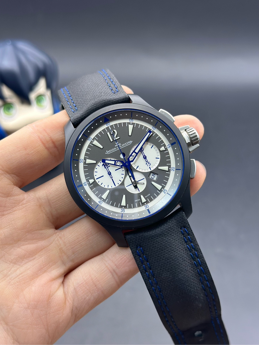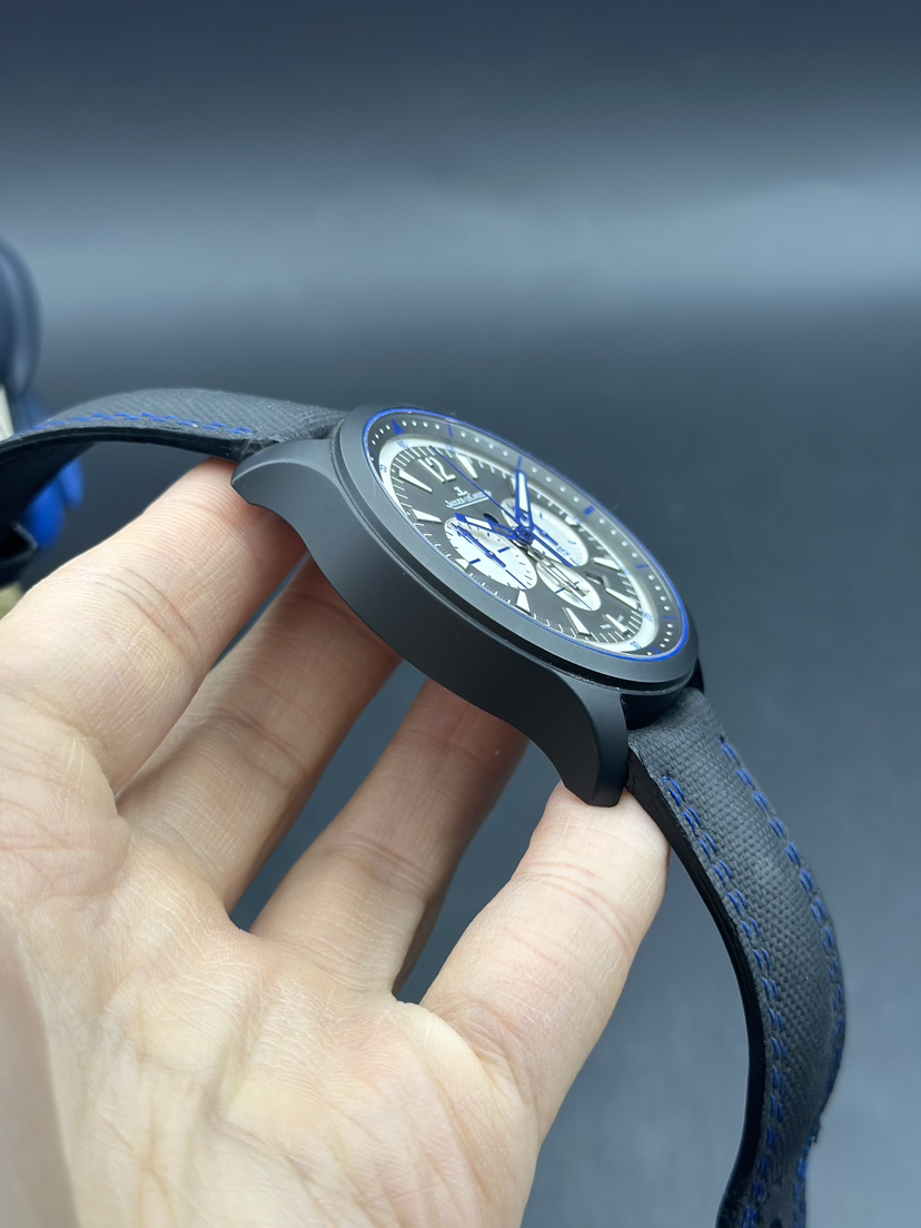 46毫米直径 黑色陶瓷表壳 针扣 灰白色面盘 蓝色指针刻度 日期显示 双时区 计时码表功能 自产机芯 Cal.757型号 300颗零件 65小时动力储备 上手非常运动时尚!颜值超高!极品成色,公价106000 现货特价带走!。