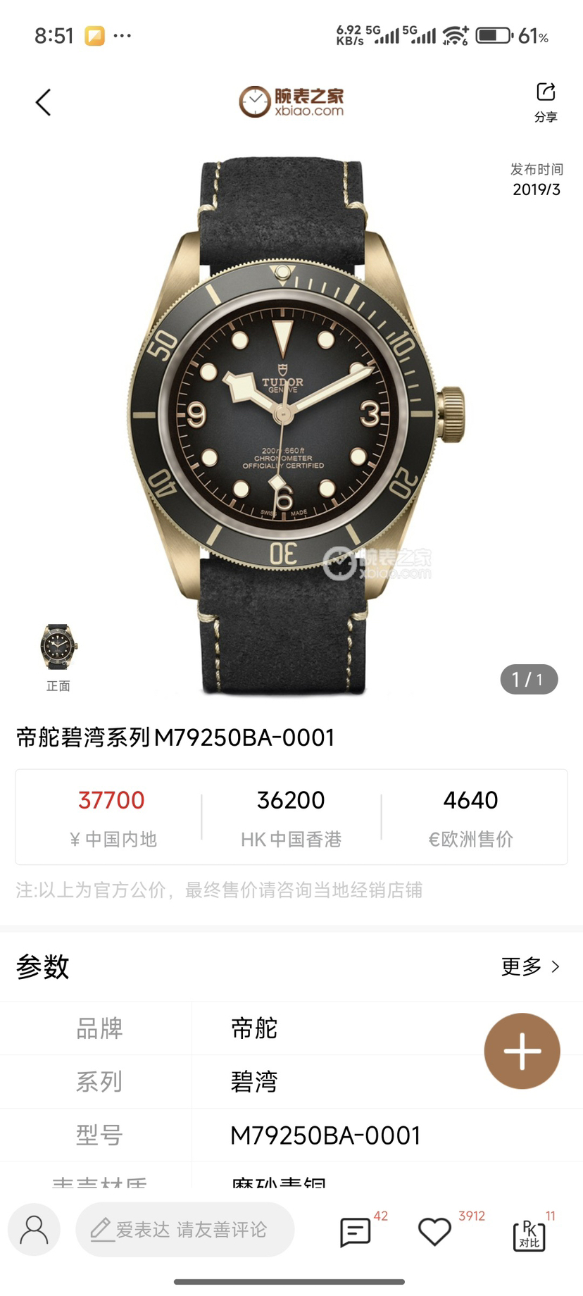 帝舵碧湾系列M79250BA-0001 43毫米表经 青铜表壳 自产机芯 200米防水 公价37700 24年二手准新成色,现货好价!