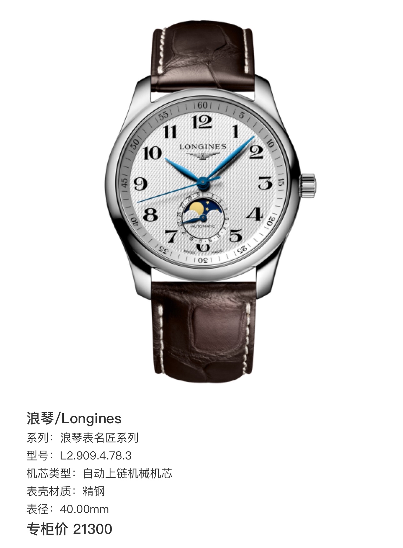 浪琴 名匠系列 L2.909.4.78.3 自动上链机械机芯 精钢 40mm表径 56字头 空白卡全套 仅试戴痕迹 专柜价21300 现好价。