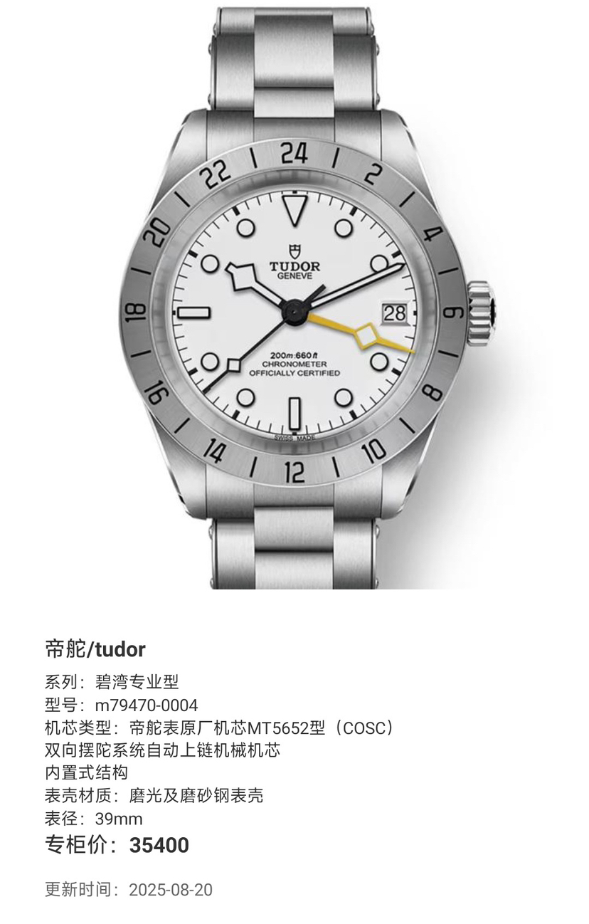 帝舵/tudor 碧湾专业型 m79470-0004 帝舵表原厂机芯MT5652型(COSC)双向摆陀系统自动上链机械机芯 内置式结构 磨光及磨砂钢表壳 39毫米表经 200米防水 专柜价35400 国行全新未使用25年11月卡,现货好价!