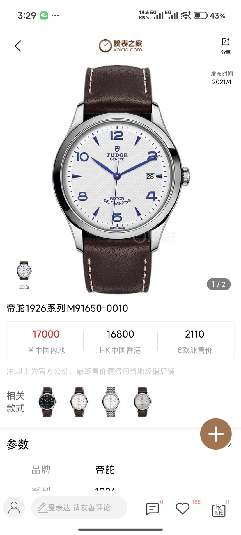 帝舵/Tudor 1926系列 m91650-0010 自动上链 钢表壳 41毫米 专柜价17000 全新未使用25年11月卡
