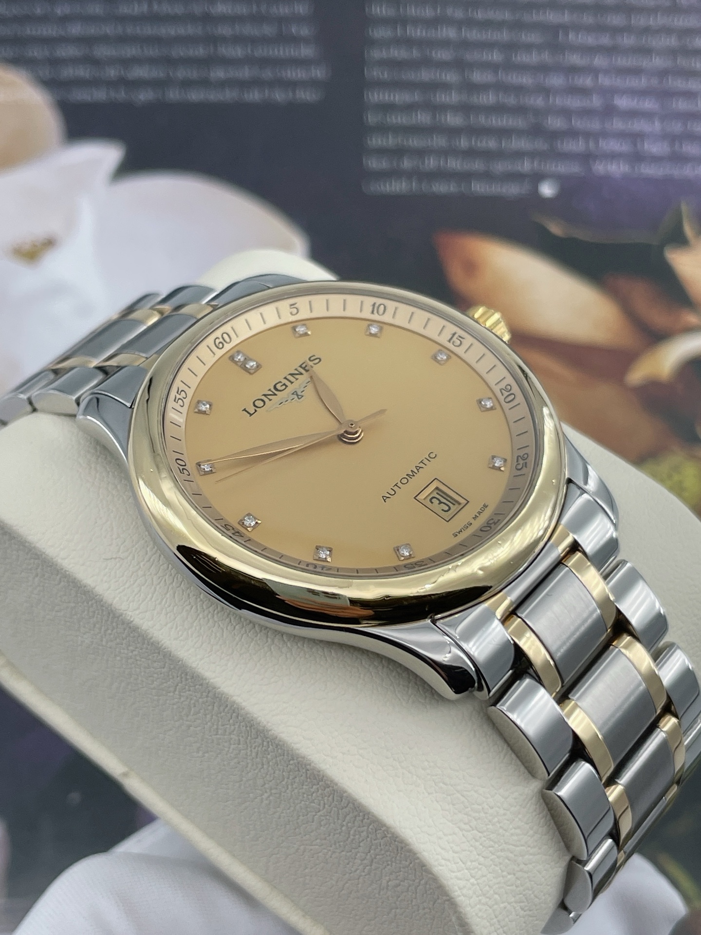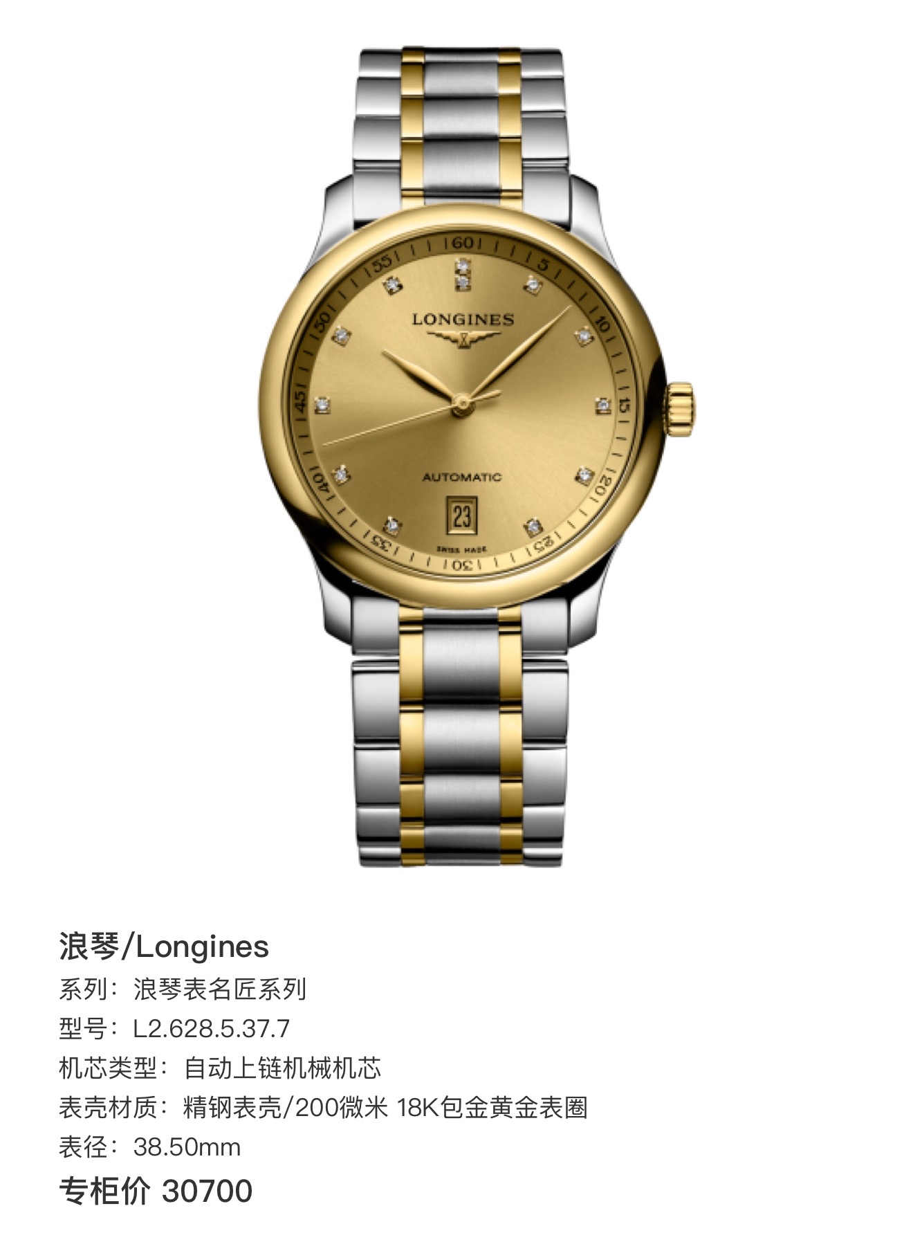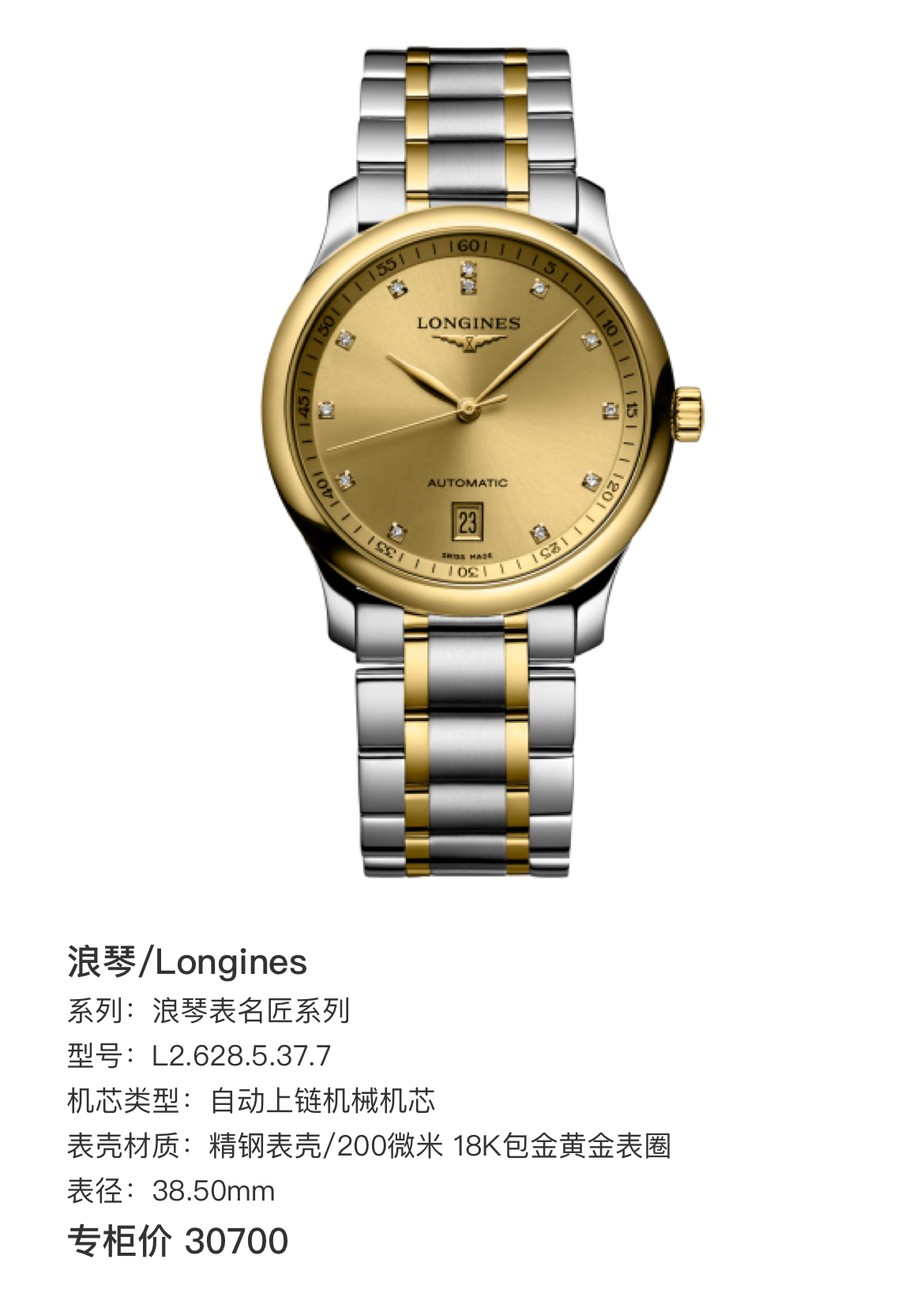 浪琴 名匠系列 L2.628.5.37.7 自动上链机械机芯 精钢表壳/200微米 18K包金黄金表圈 38.5mm表径 专柜价30700 单表好价。