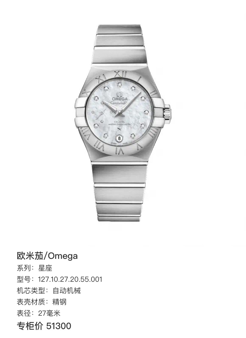 全新全套欧米茄/Omega 星座 127.10.27.20.55.001 自动机械 精钢 27毫米 专柜价51300,全新全套