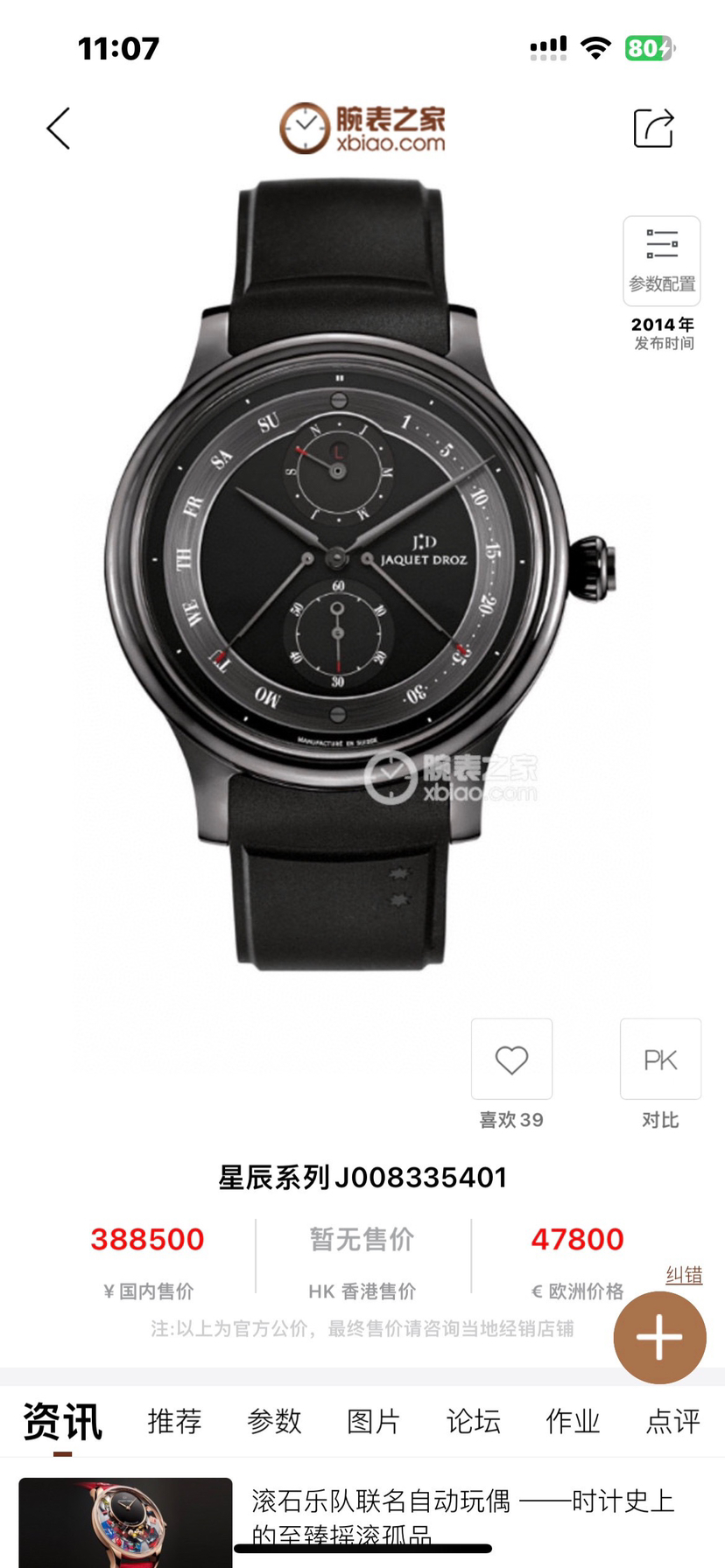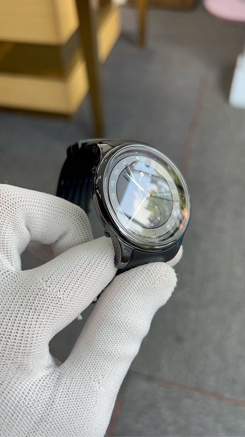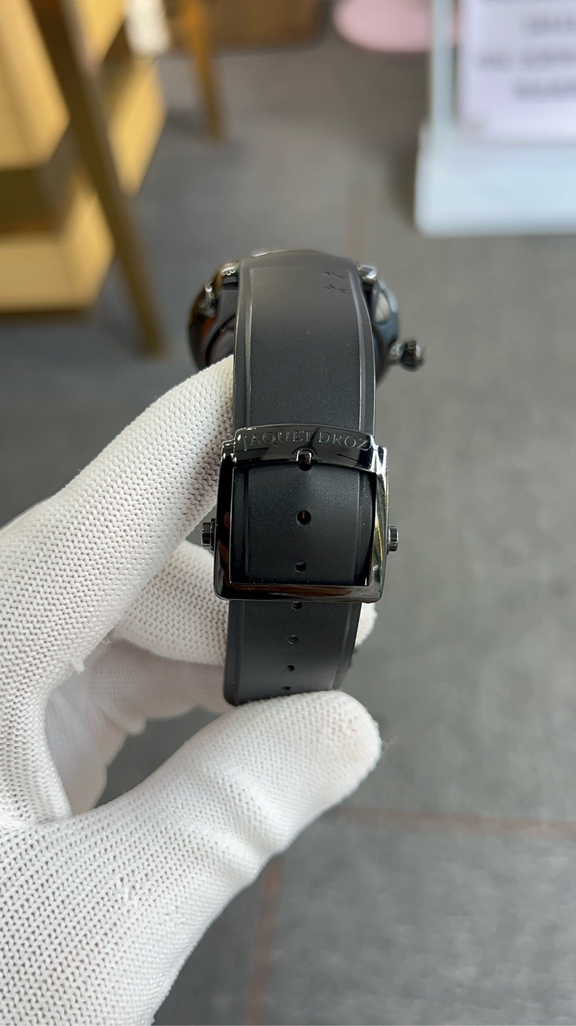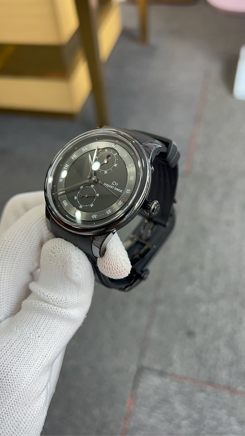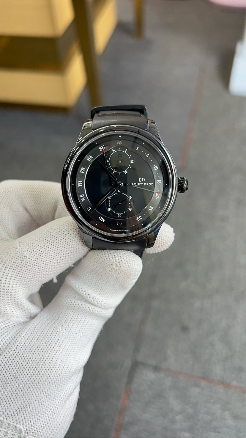 未使用专柜29折。雅克德罗J008335401 全球限量88只 (限量号28/88)黑色陶瓷表壳 万年历显示 自动机械 黑色橡胶表带大全套 未使用99新 工价388000。