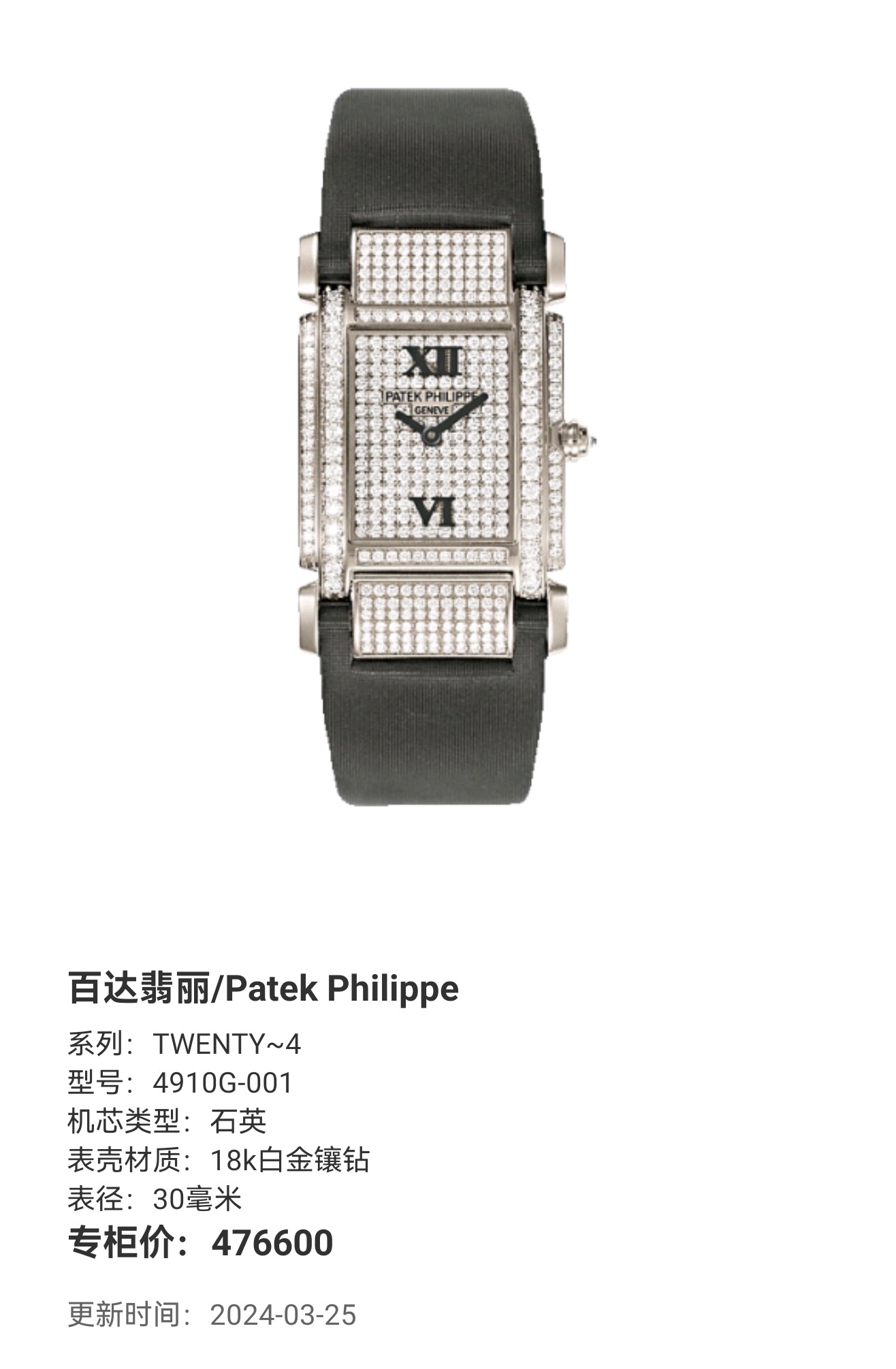 百达翡丽 TWENTY~4 4910G-001 石英 18k白金镶钻 30mm表径 专柜价476600 单表好价。