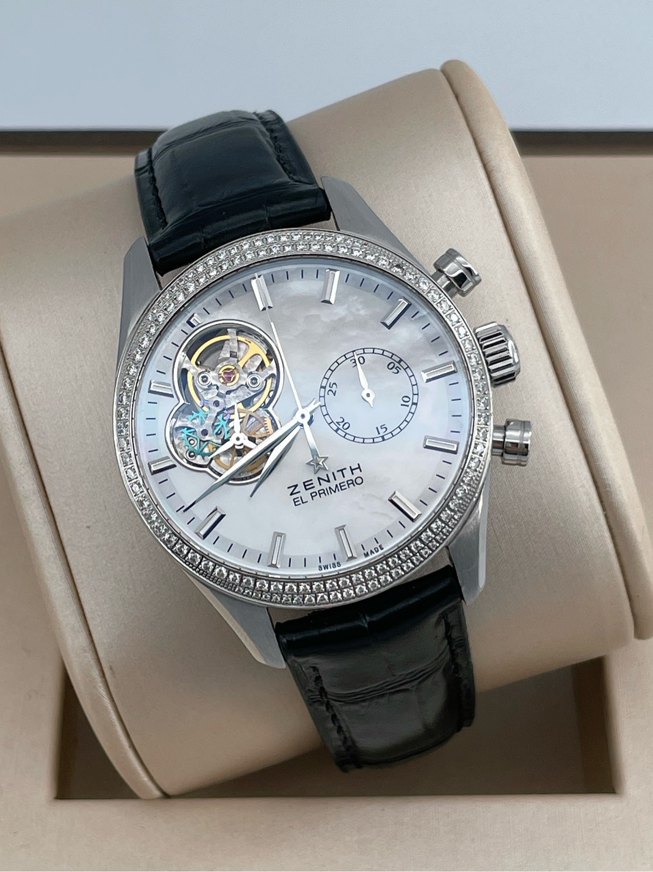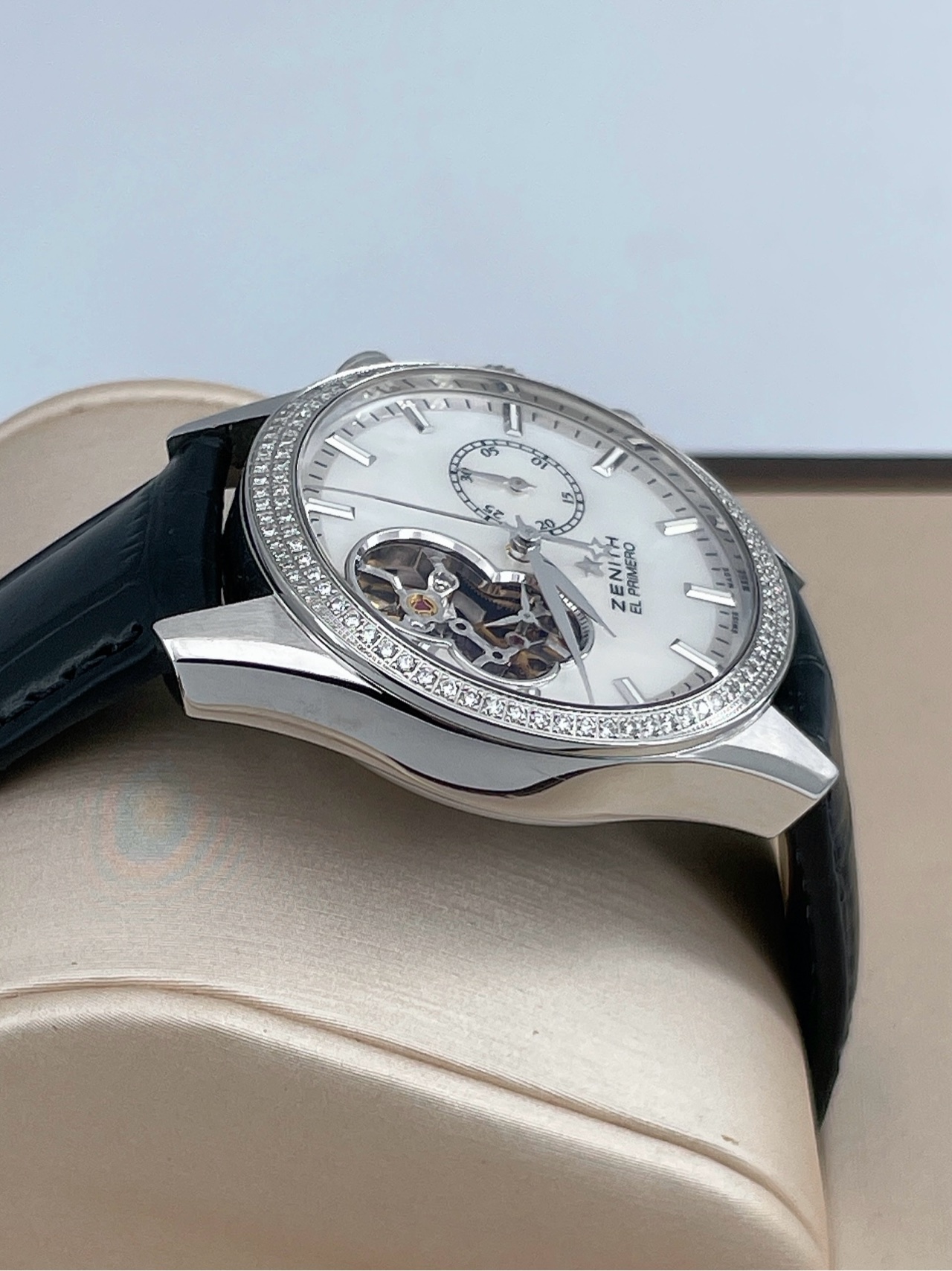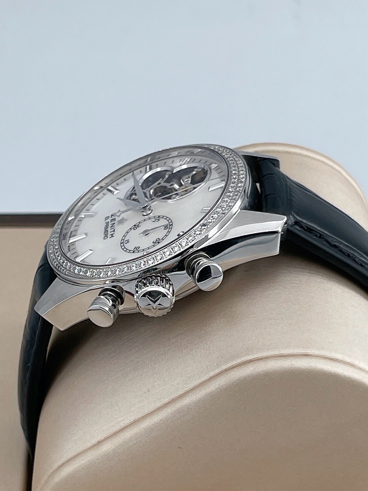 真力时 旗舰系列 16.2150.4062/81.C754 自动机械 38mm表径 白色贝母盘搭配镂空机芯 外圈原钻 15年表、保卡 公价73800 现货好价。