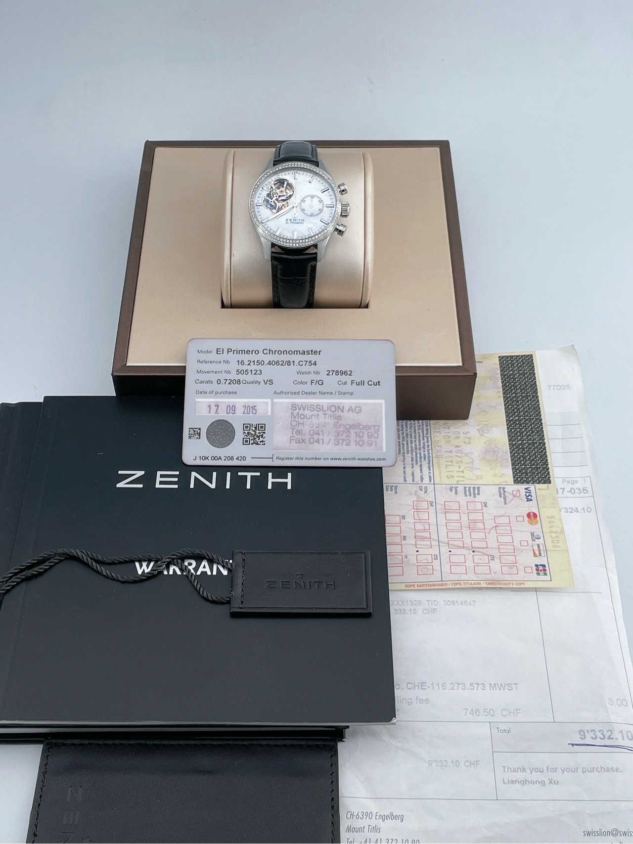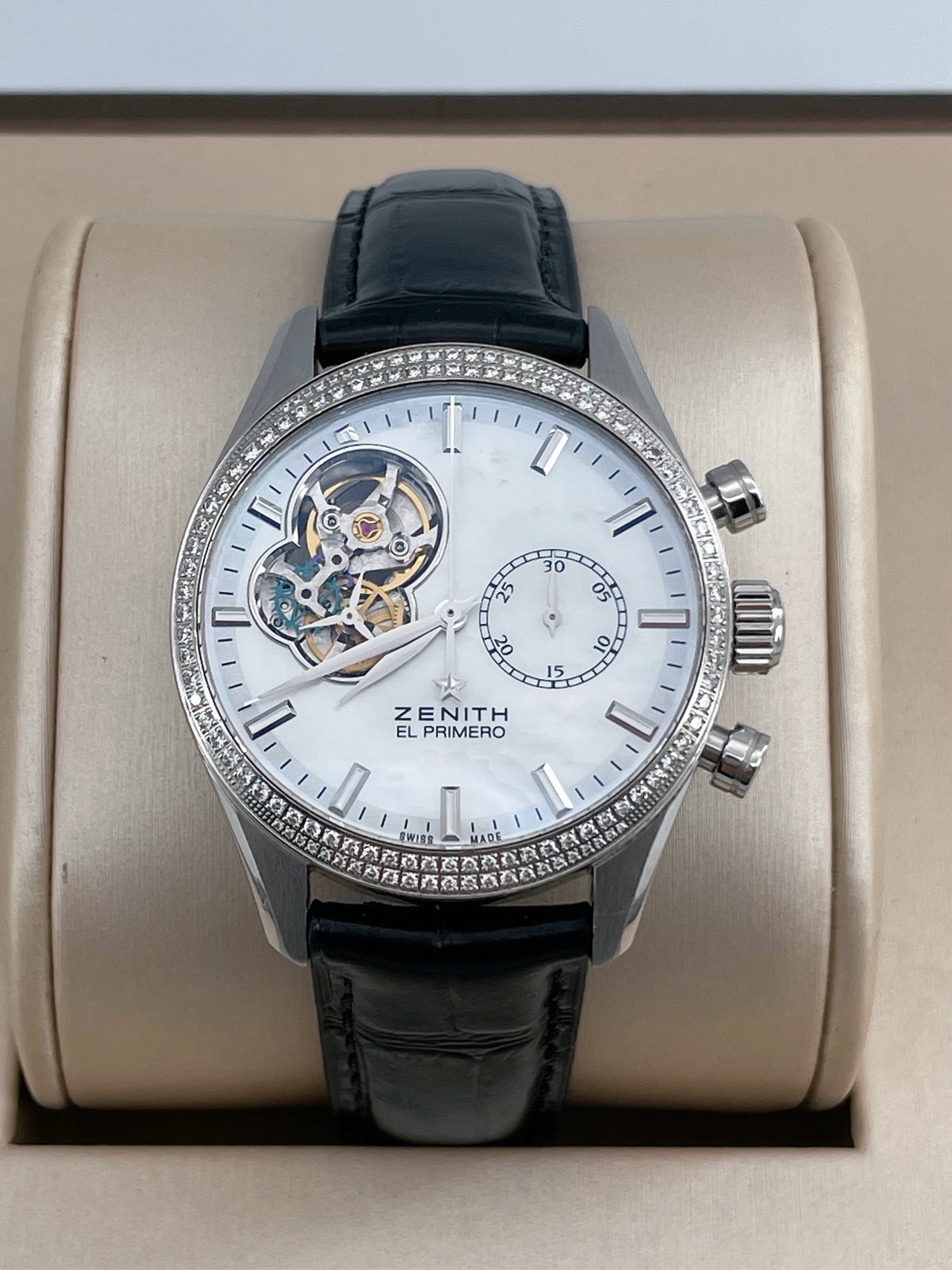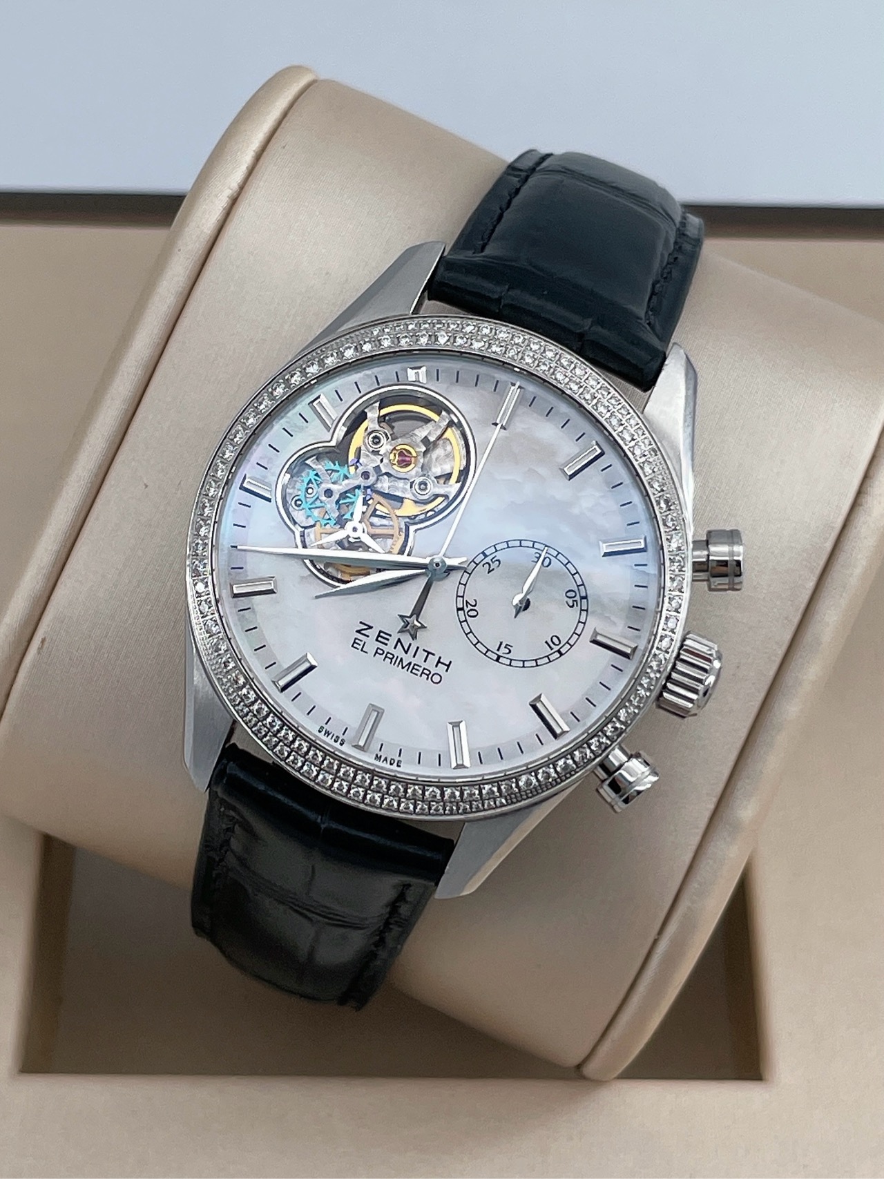 真力时 旗舰系列 16.2150.4062/81.C754 自动机械 38mm表径 白色贝母盘搭配镂空机芯 外圈原钻 15年表、保卡 公价73800 现货好价。