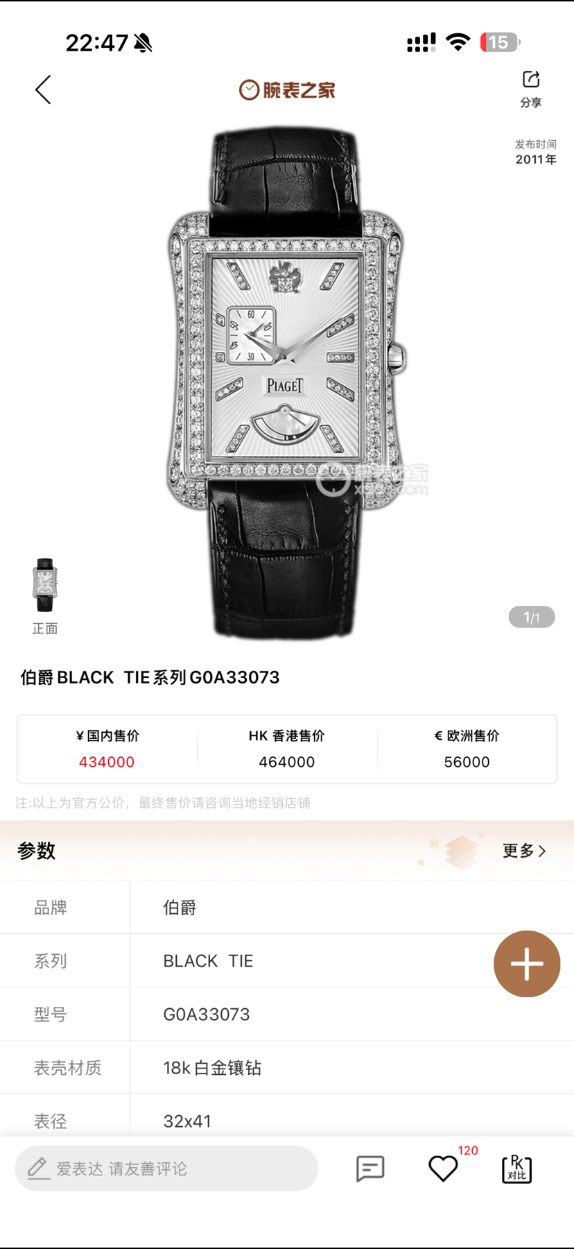伯爵 BLACK TIE系列 G0A33073白盘原钻 32*41表径 白金材质 专柜价434000 14年全套,现货好价。