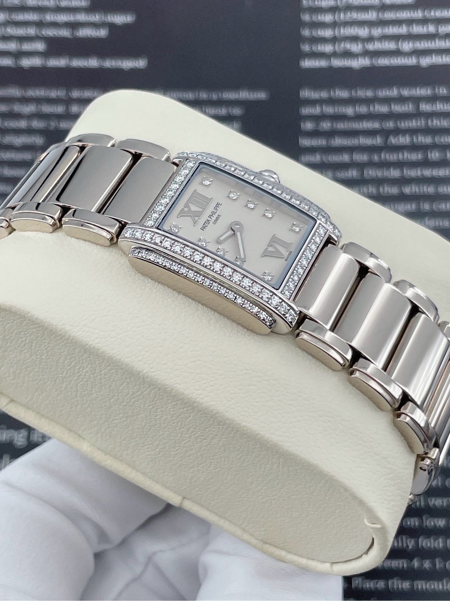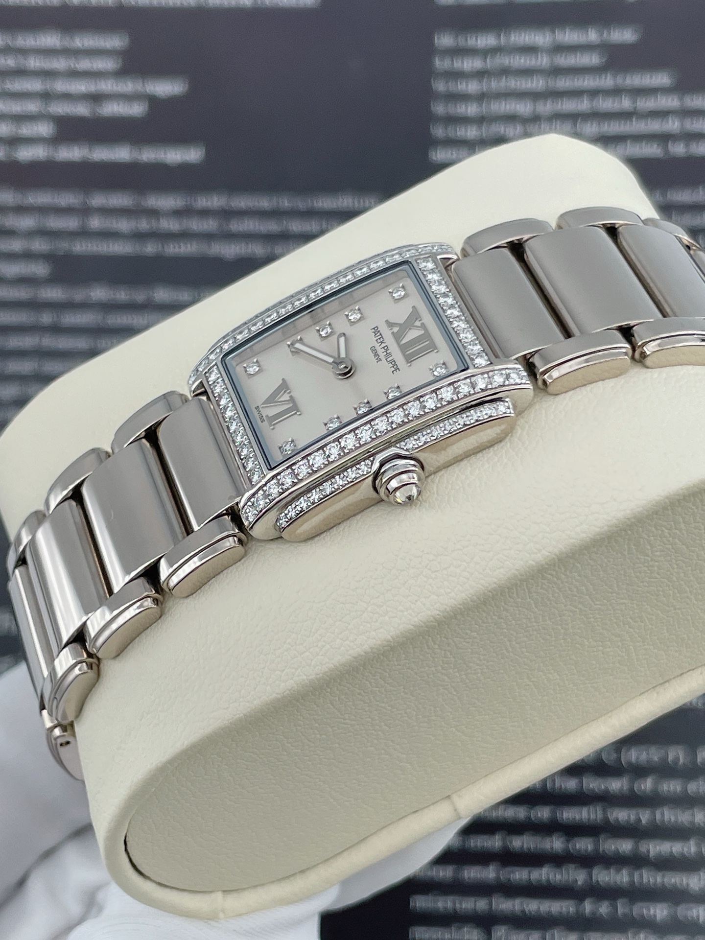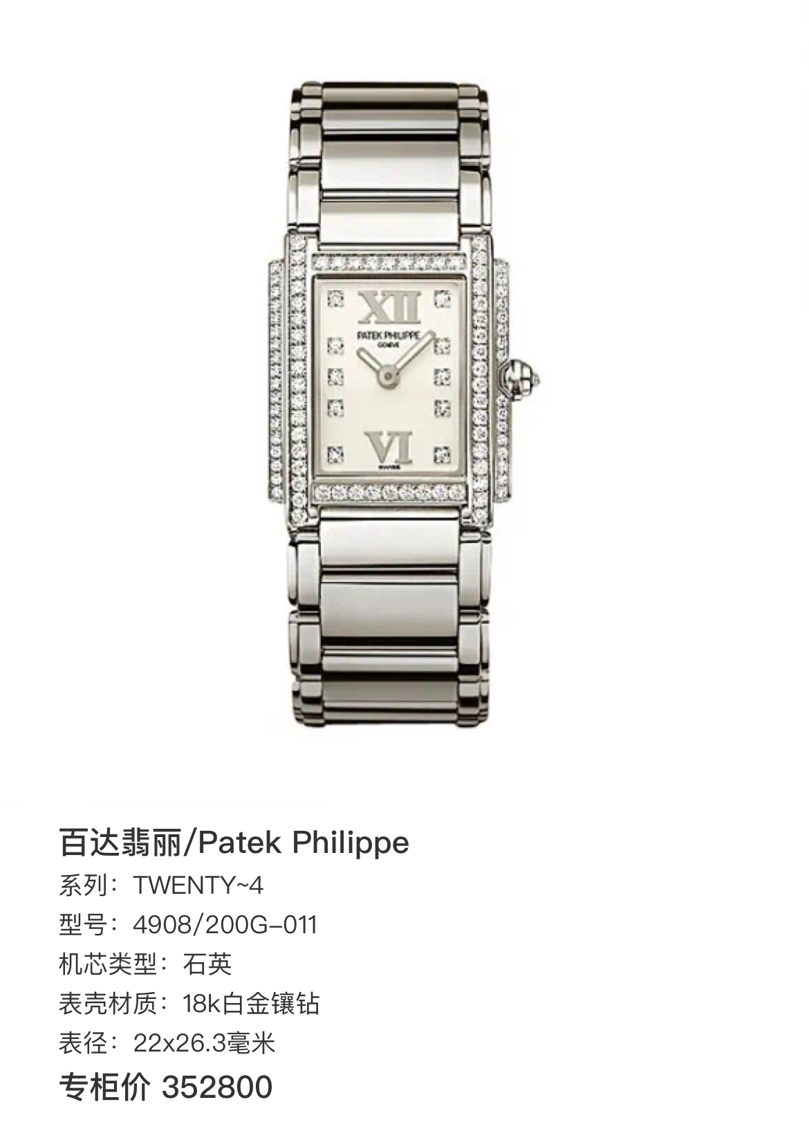 百达翡丽 TWENTY~4系列 4908/200G-011 石英 18k白金镶钻 22x26.3mm表径 专柜价352800 单表好价。