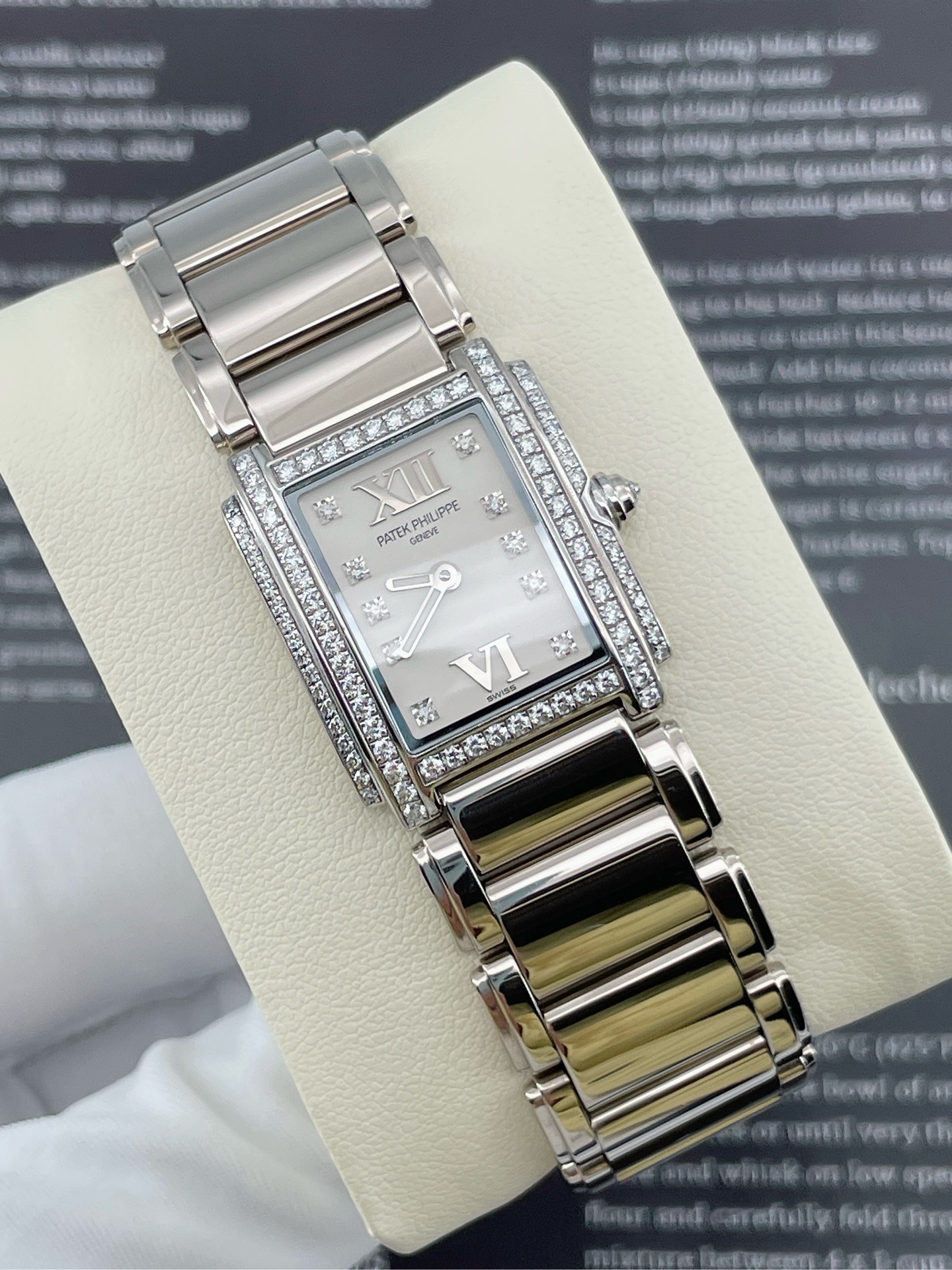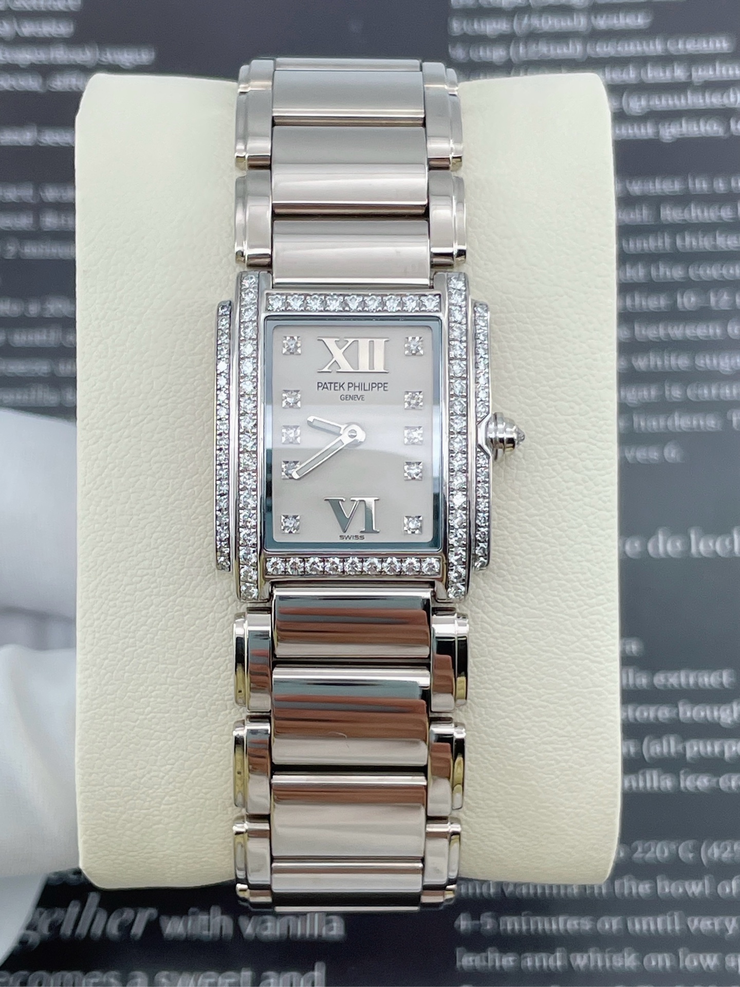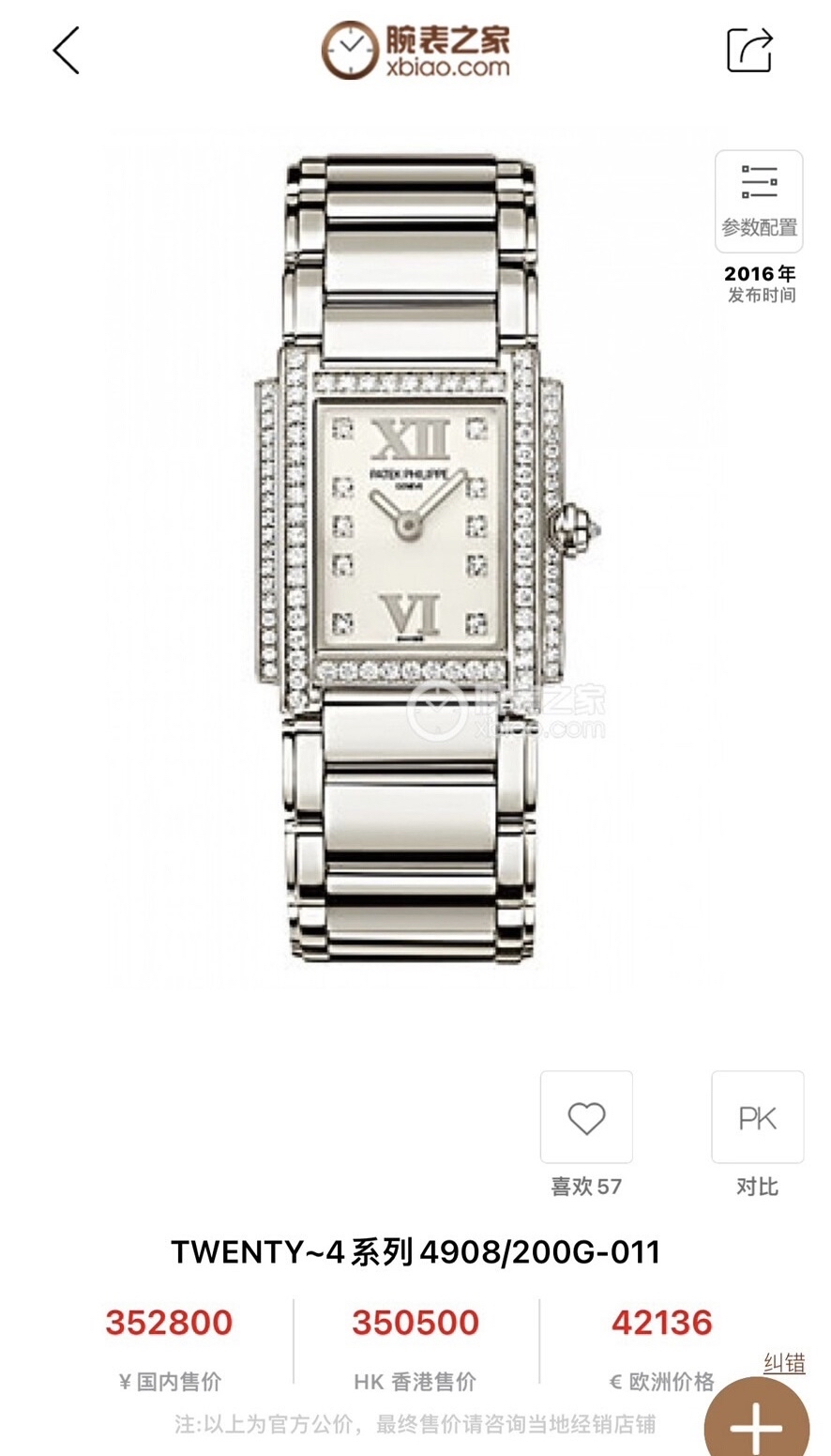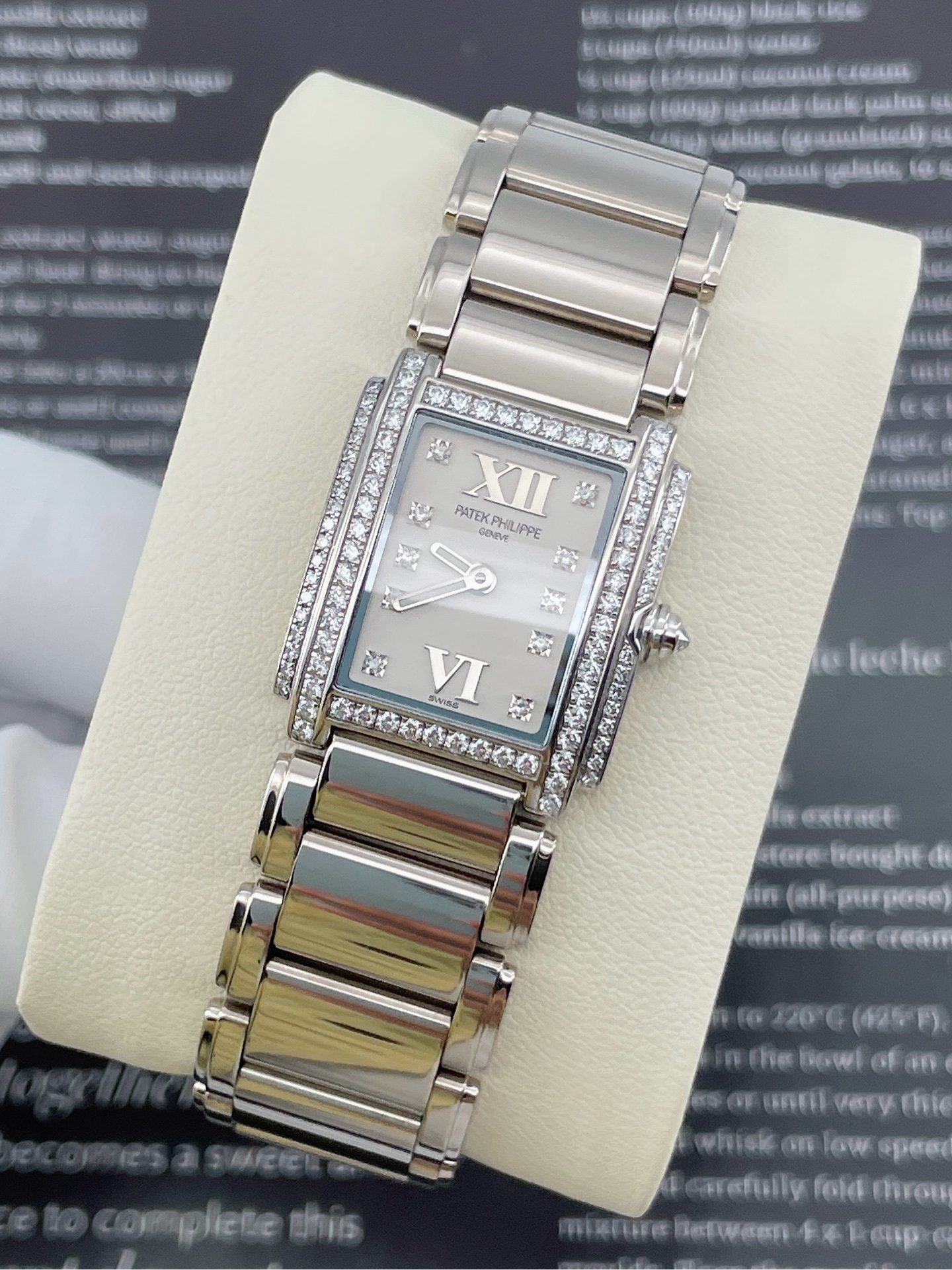百达翡丽 TWENTY~4系列 4908/200G-011 石英 18k白金镶钻 22x26.3mm表径 专柜价352800 单表好价。
