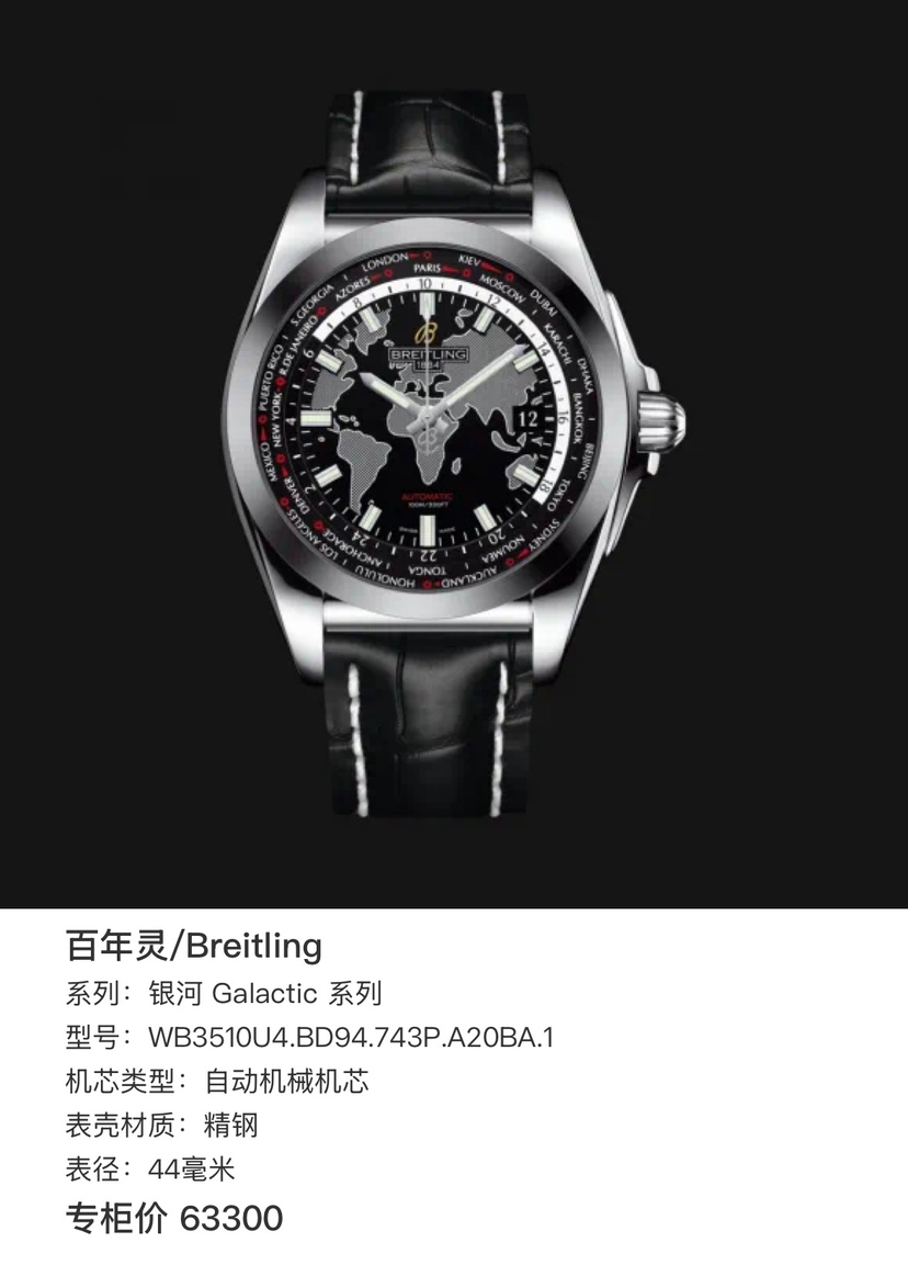 百年灵/Breitling 银河 Galactic 系列 WB3510U4.BD94.743P.A20BA.1 自动机械机芯 精钢 44毫米 专柜价63300
