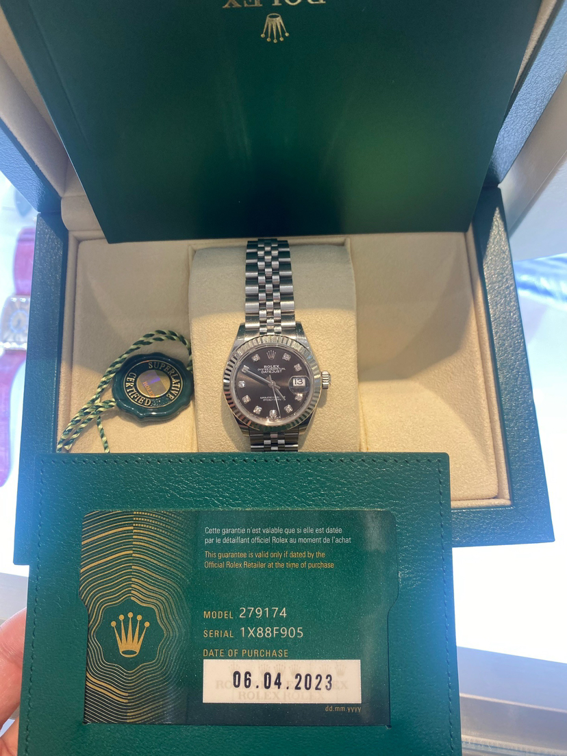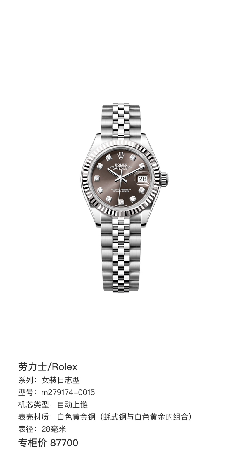 劳力士/Rolex 女装日志型 m279174-0015 自动上链 白色黄金钢(蚝式钢与白色黄金的组合) 28毫米 附件:23年全套 专柜价87700