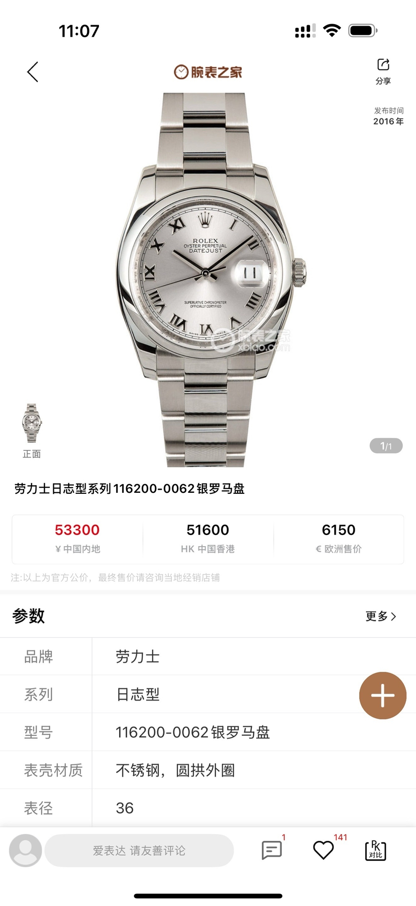 【全膜二维码】劳力士116200-0062日志型男士自动机械表,银罗马面,表径36mm,库存未使用品全套全膜二维码均在,16年1月保卡,公价53300,现货好价。