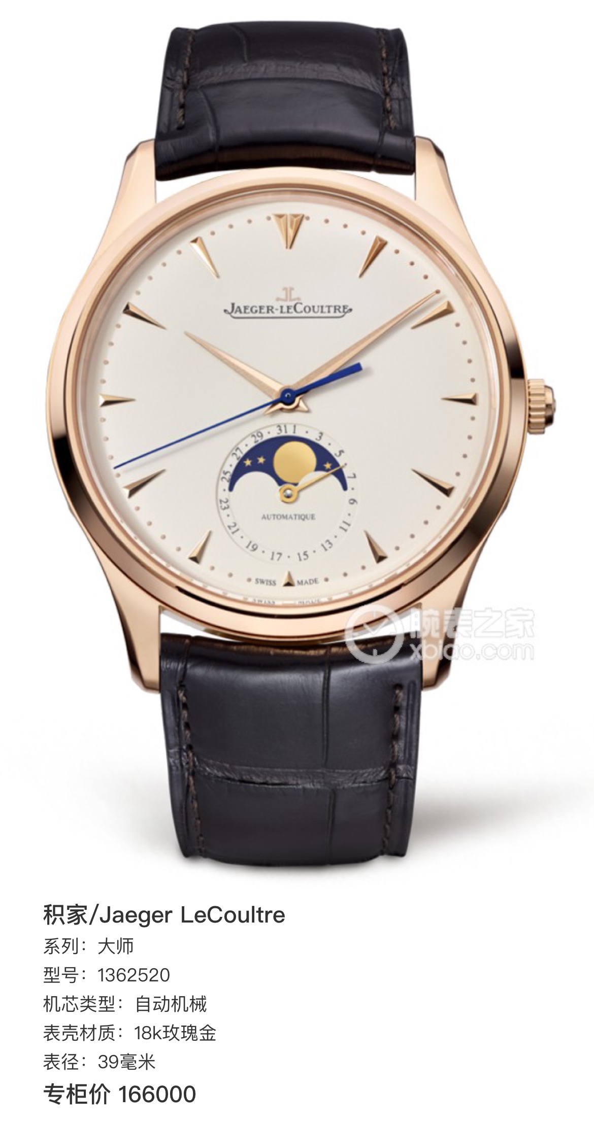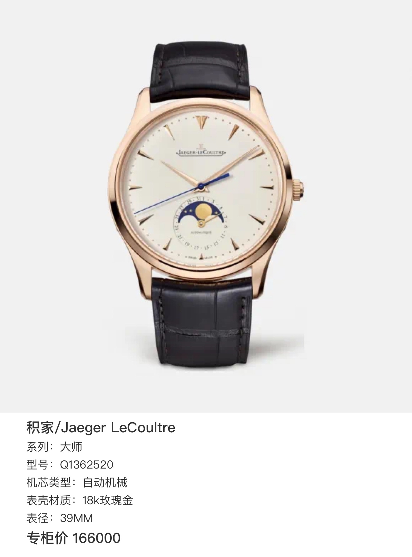 积家 大师 Q1362520 自动机械 18k玫瑰金 39mm表径 专柜价166000 单表好价。