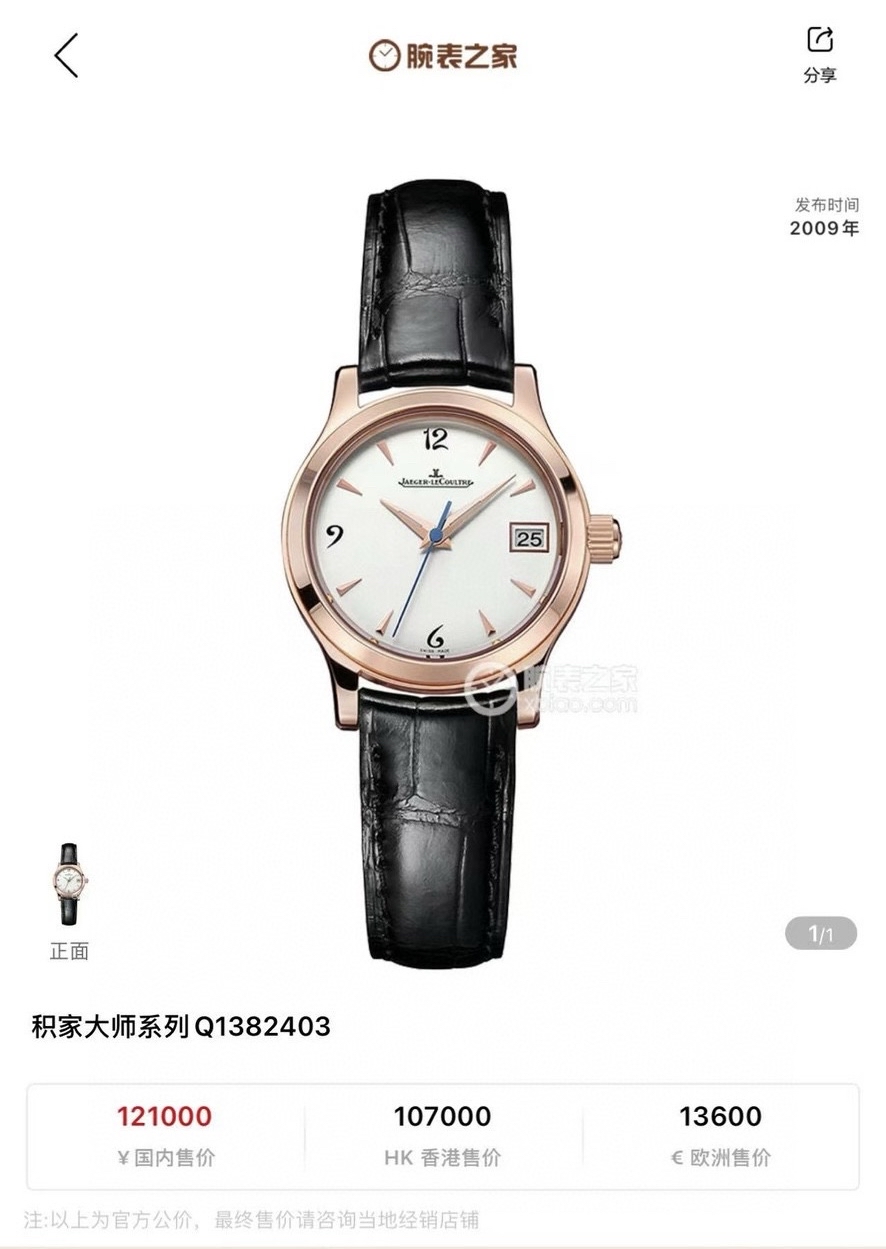 积家 大师 Q1382403 自动机械 18k玫瑰金 27.5mm表径 专柜价121000 单表好价。