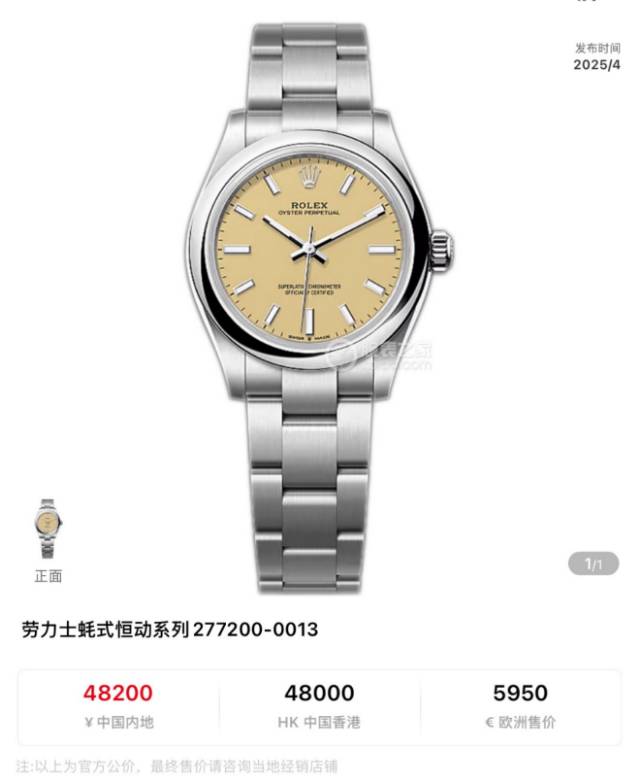 劳力士277200-0013蚝式恒动,沙米色黄,31mm表径,全套未使用品,有。