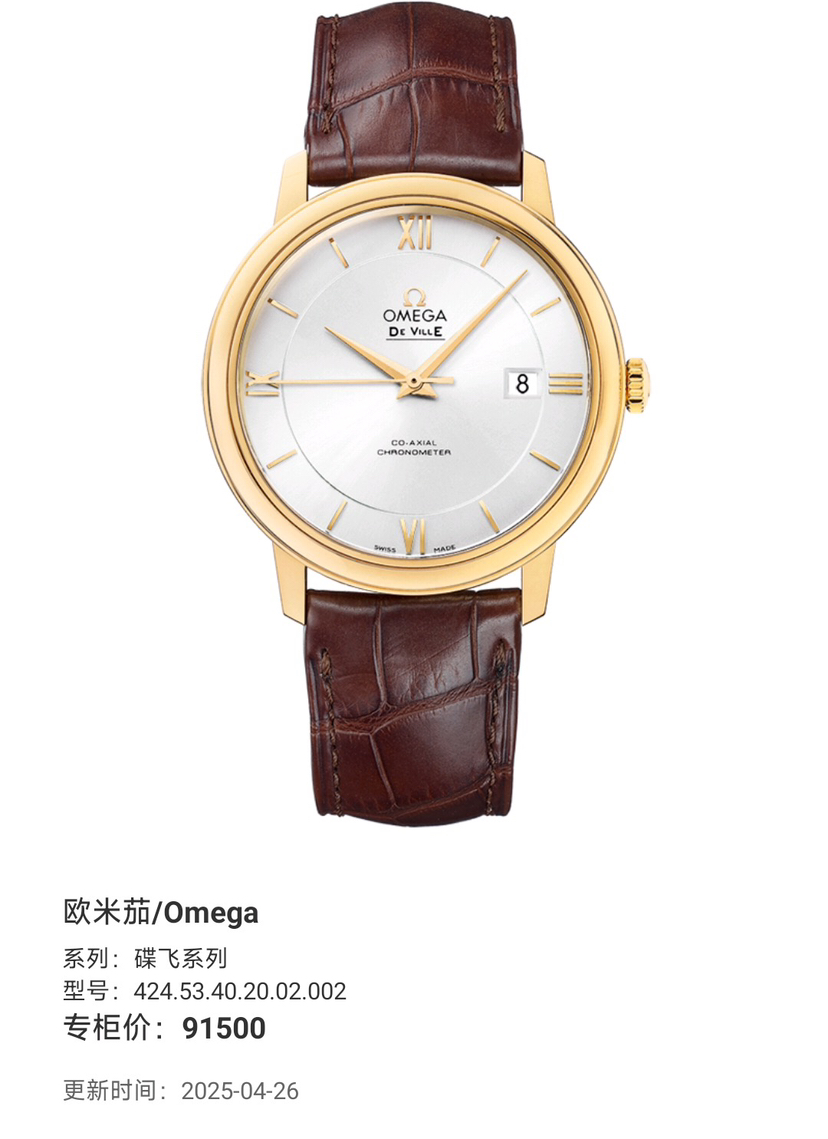 欧米茄/Omega 碟飞系列 424.53.40.20.02.002 39.5毫米表经 18k金表壳表扣 专柜价91500 国行全新未使用25年11月卡 现货好价!