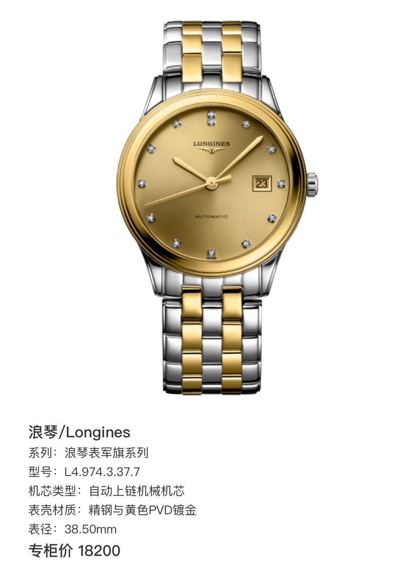 全新浪琴/Longines 浪琴表军旗系列 L4.974.3.37.7 自动上链机械机芯 精钢与黄色PVD镀金 38.50mm 专柜价18200