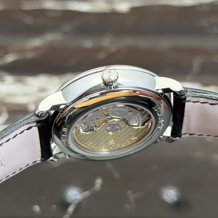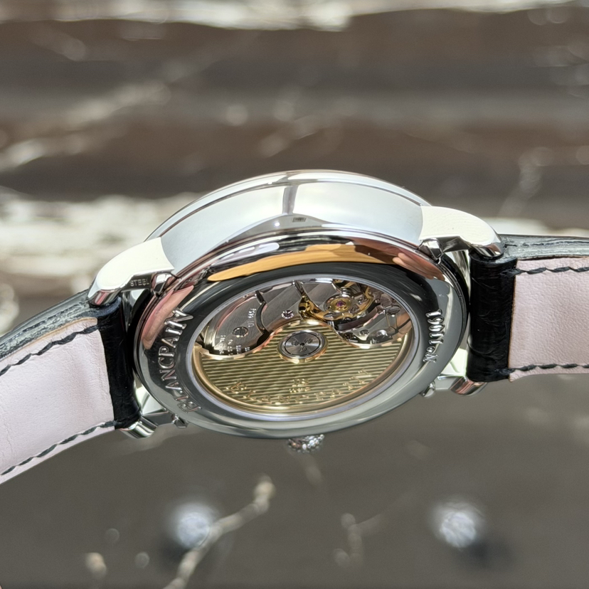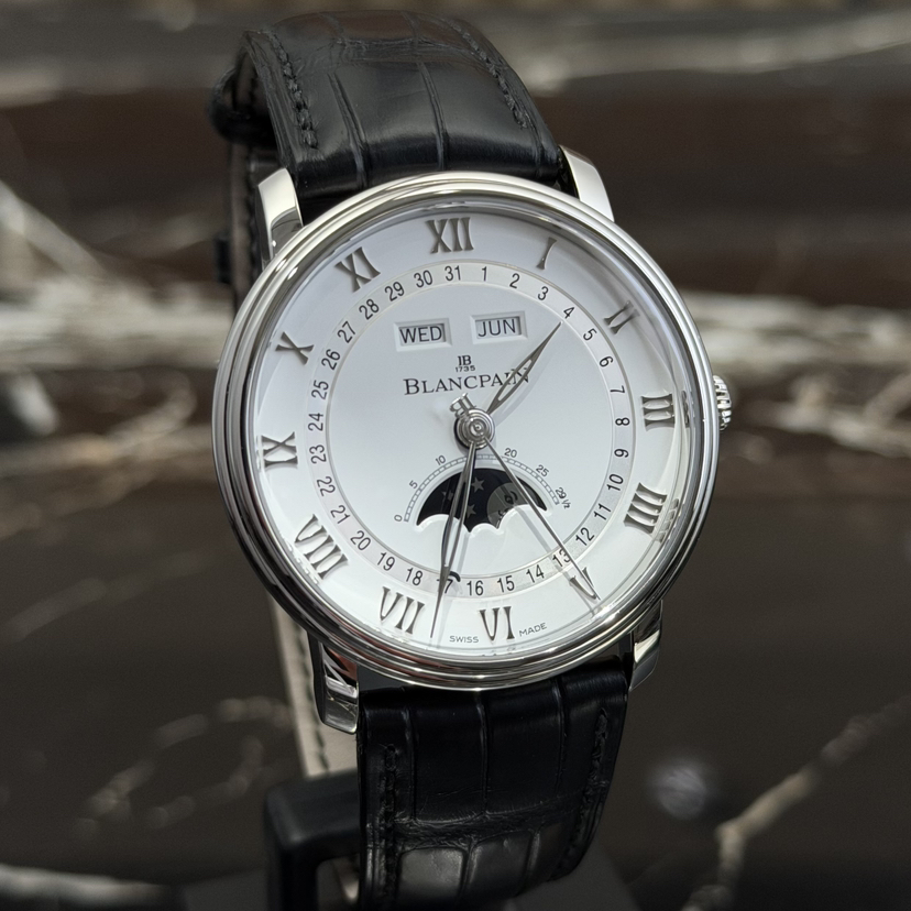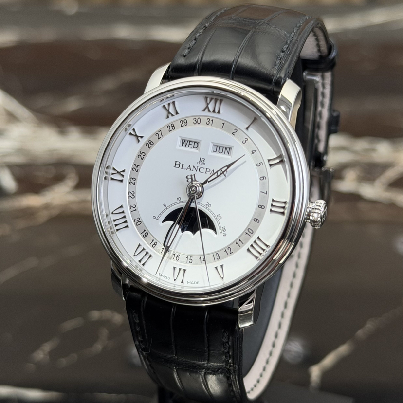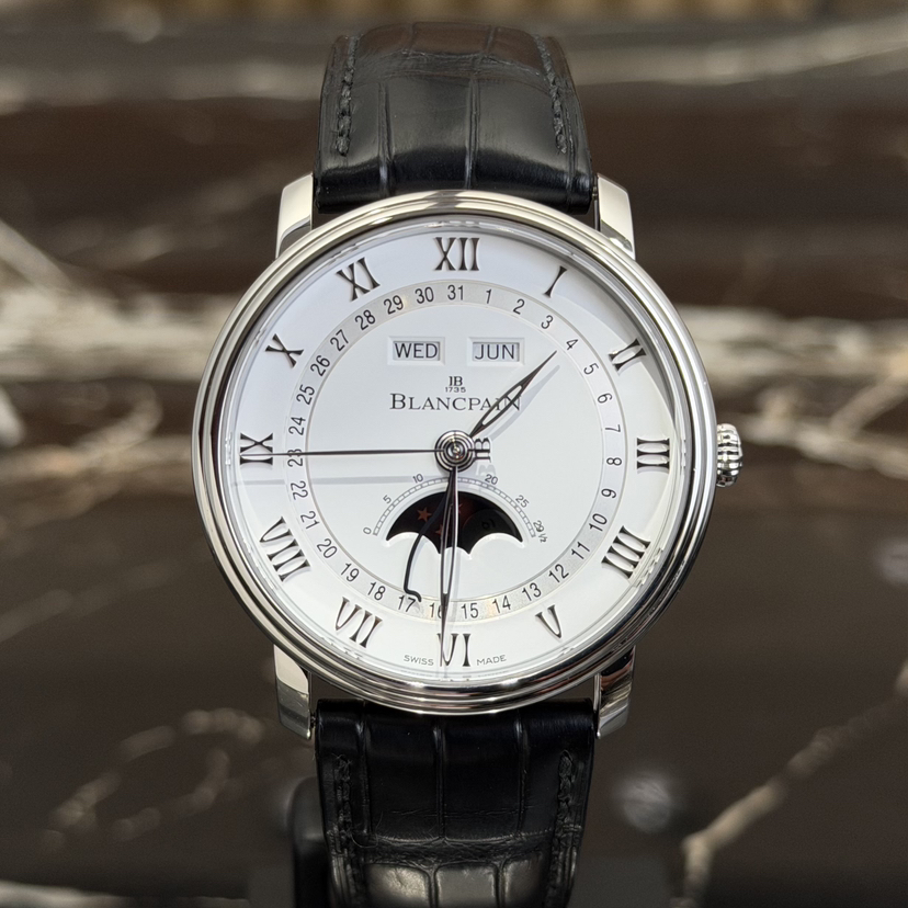 宝珀/Blancpain Villeret经典系列 6654A 1127 55B Automatik 精钢 40mm 白色表盘,银色刻度指针,银色轨道日历盘,复杂功能全历显示,蓝色日历针,6点位超美笑脸月相,精钢打造,超薄设计,搭载背透自产6654型自动上链机芯,72小时动力储备,折叠表扣