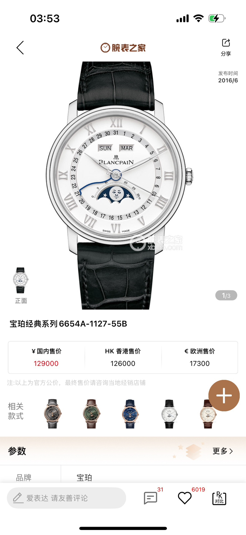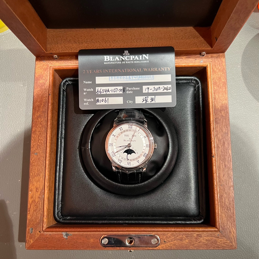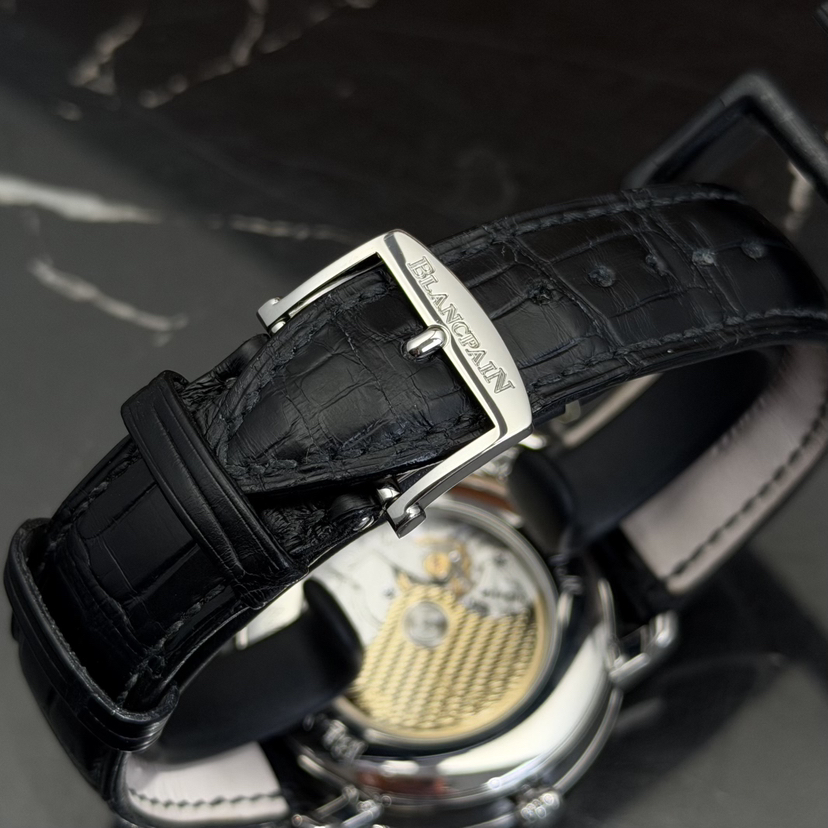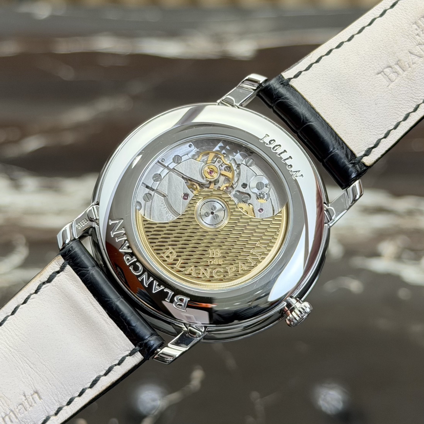 宝珀/Blancpain Villeret经典系列 6654A 1127 55B Automatik 精钢 40mm 白色表盘,银色刻度指针,银色轨道日历盘,复杂功能全历显示,蓝色日历针,6点位超美笑脸月相,精钢打造,超薄设计,搭载背透自产6654型自动上链机芯,72小时动力储备,折叠表扣