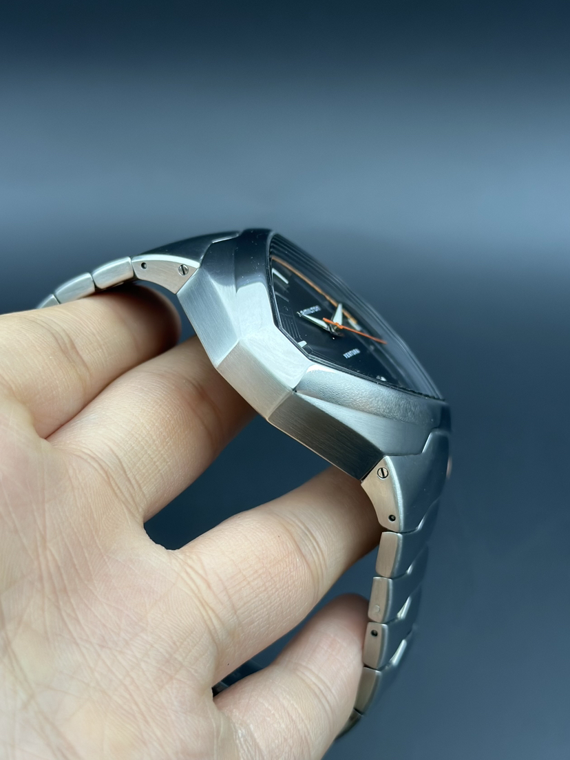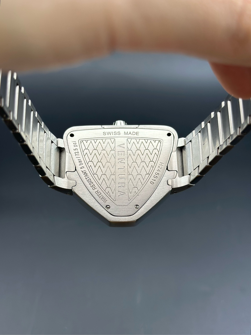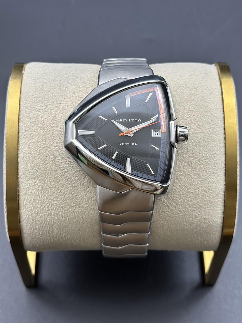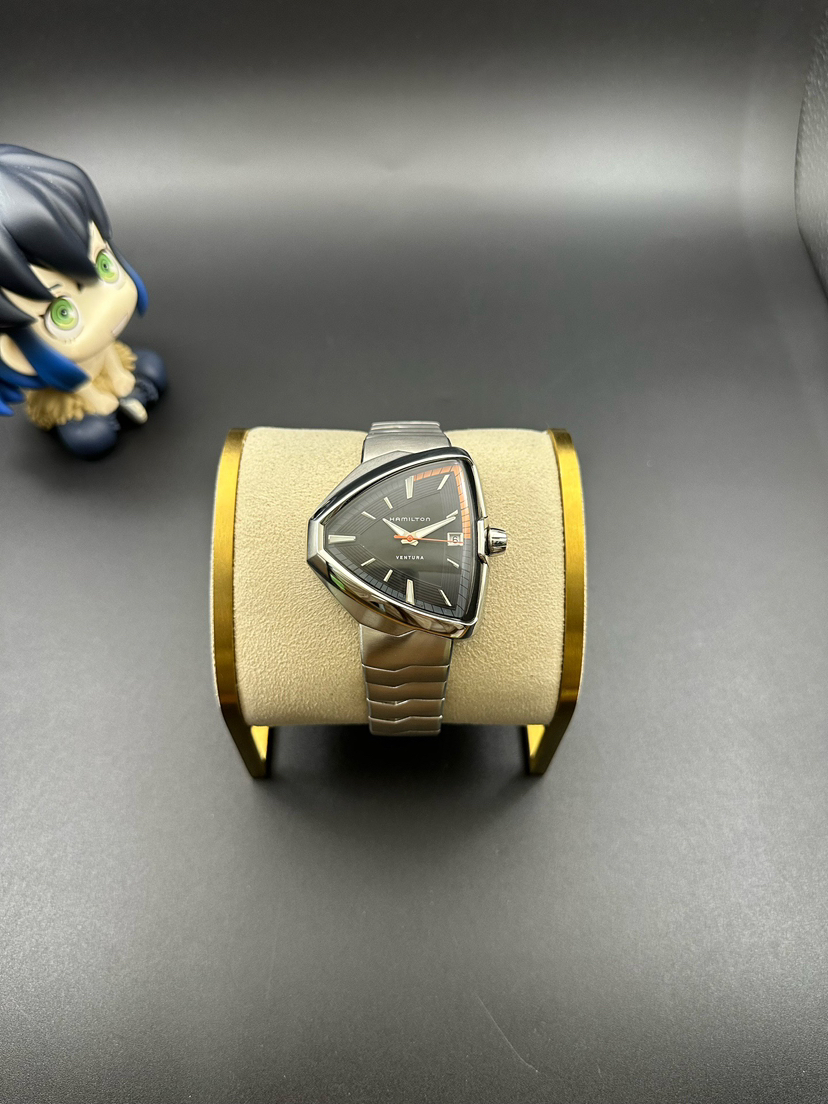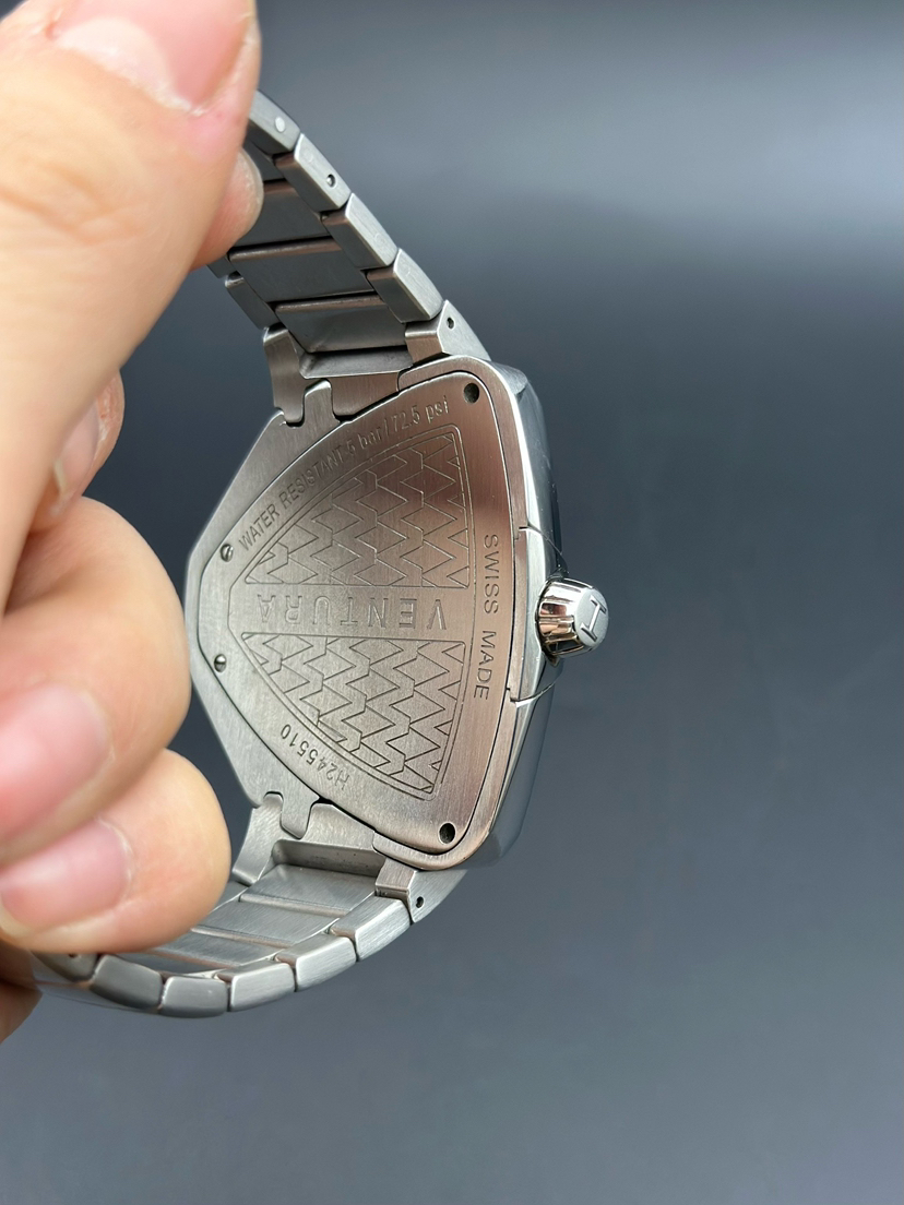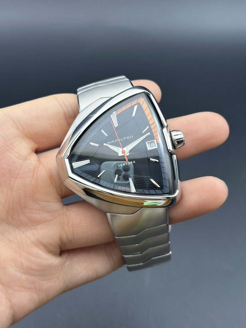 汉米尔顿 猫王八十周年限定 H24551131,42.5*44.6毫米表径,黑色表盘镀镍,白色Superluminova夜光涂层,石英机芯,银色表带包裹感强烈与手腕高度契合,公价8300,现货特价!