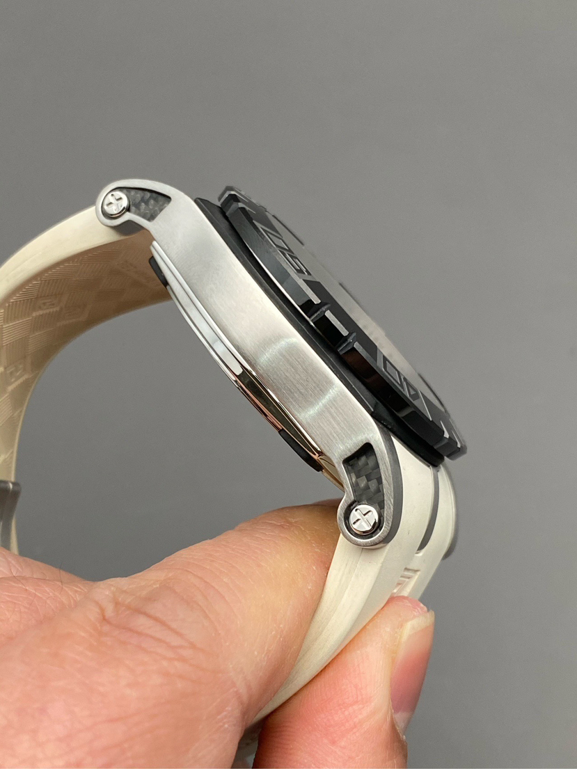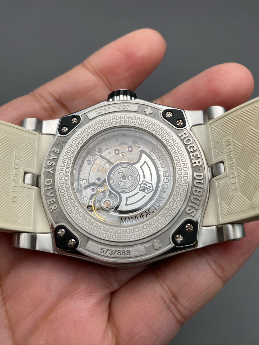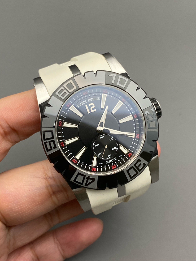 罗杰杜彼历史系列46mm大表径,钢材质表壳,可旋转黑色陶瓷外圈,小三针布局,白色夜光刻度带红色阿拉伯数字点缀,自产RD821双日内瓦印记自动机芯,300米防水潜水表,全球限量发行888枚